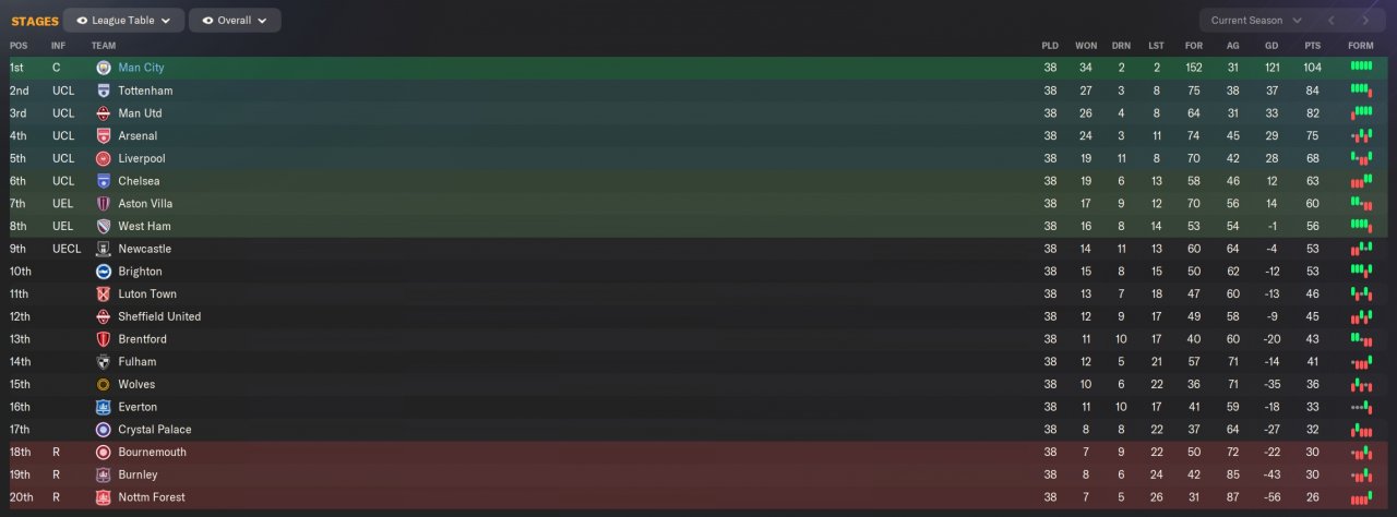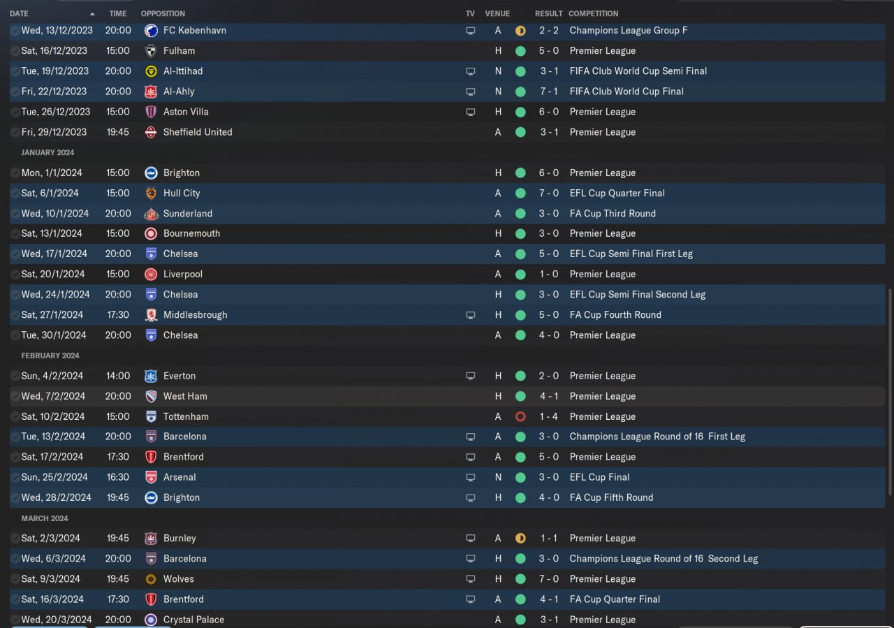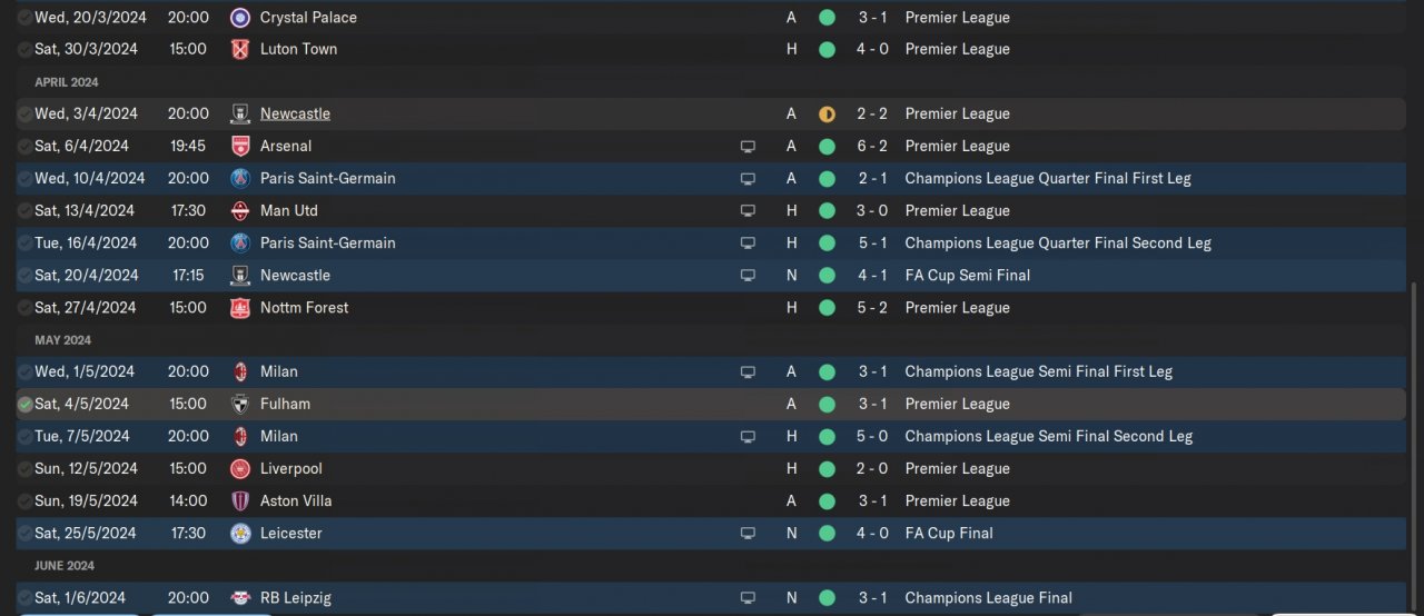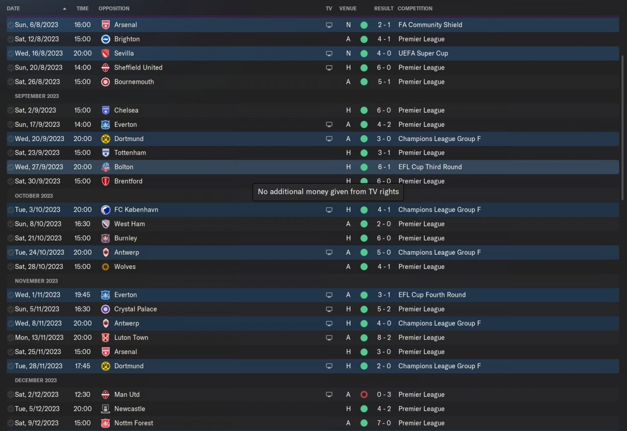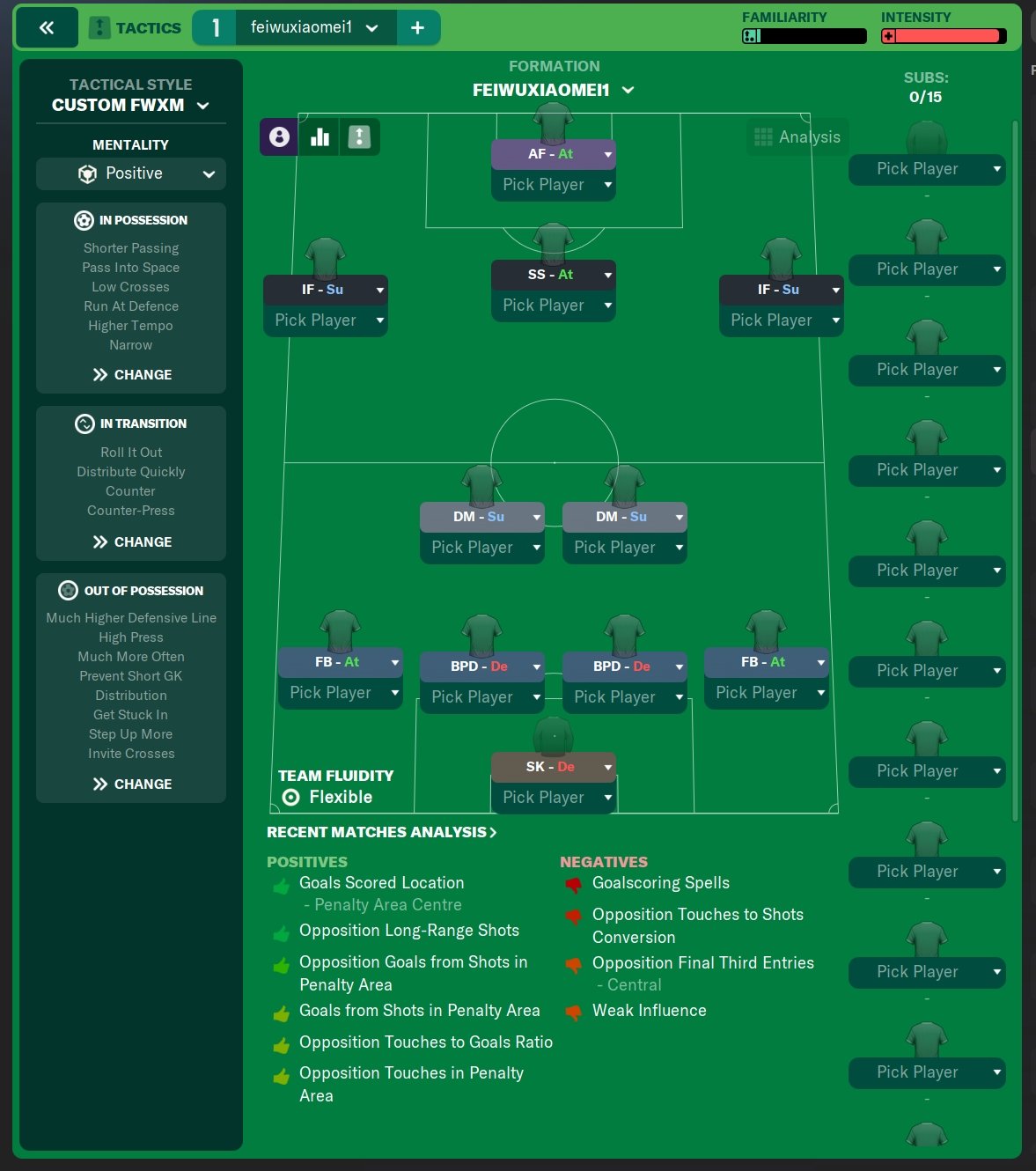 Trying a 4231 with as little PIs as possible (only “dribble more” and “get stuck in”) and all positive team instructions according to Zippo’s testing (neutral instructions like focus play down the flanks/overlaps/underlaps are not used).