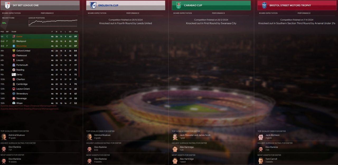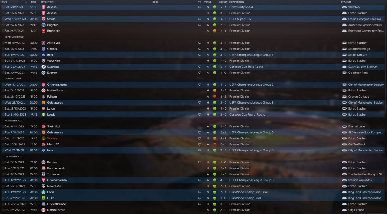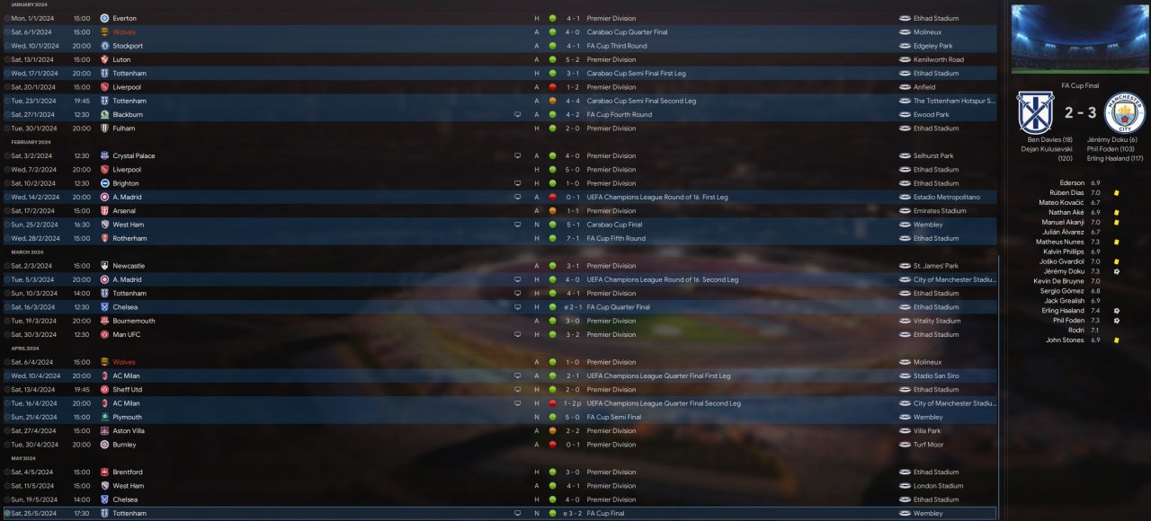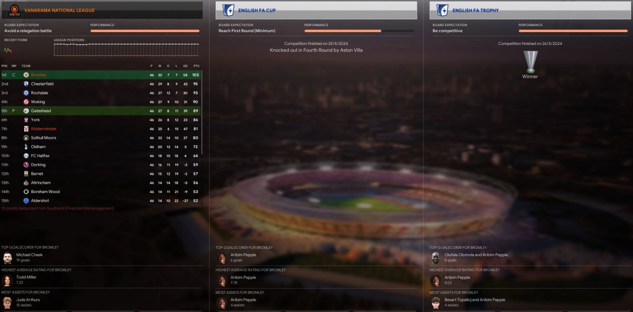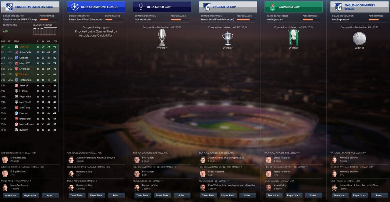 Results were pretty impressive, winning all 3 Leagues. Man City won everything except the CL, going down in the quarters in a penalty shoot out. Bromley also won the FA Trophy on top of the VNL.