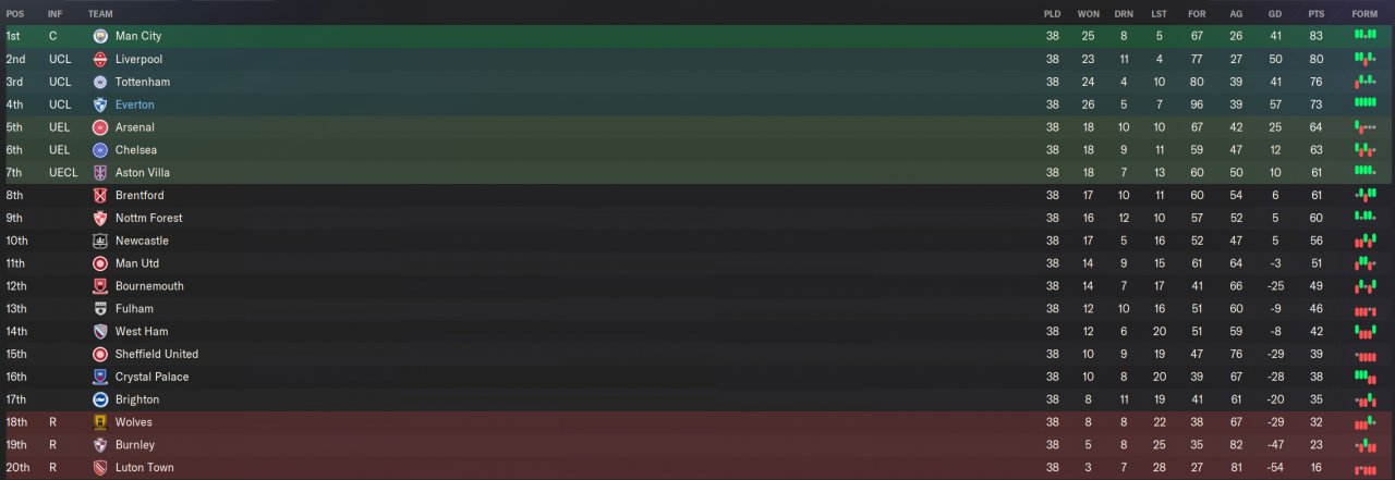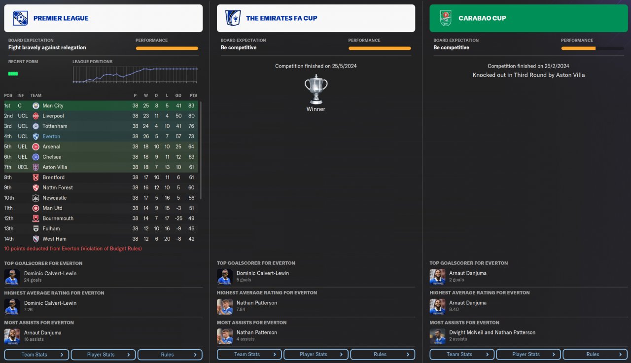 4th in PL as Everton (would have won without -10 penalty) and won FA Cup. Performed extremely well against much better teams but mediocre against worse teams.