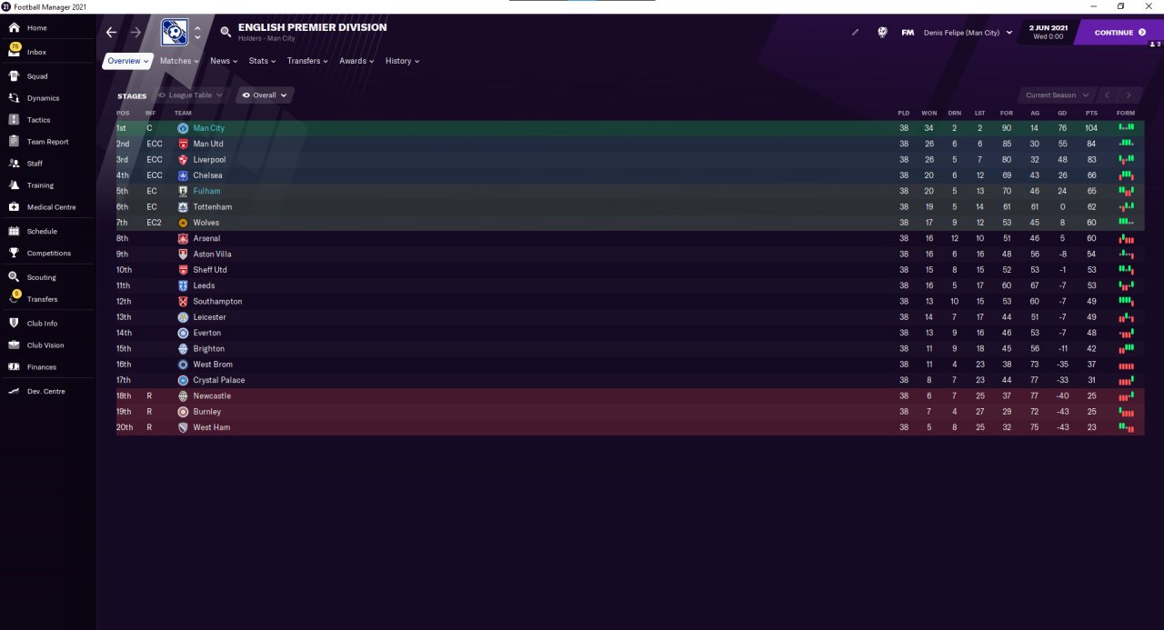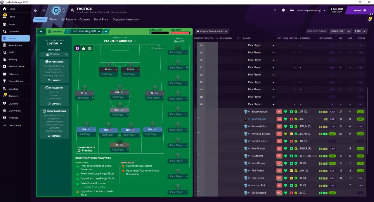 This is a tweak of Blue 3.0, with Wingers instead of Defensive Wingers. To work well, they inherited similar player instructions, including Close Down More to press against throw-ins. In my experiments, it gets more points per season than Blue 3.0, but also a smaller goal difference. Just like Blue 3.0, you can change the role of DLP to DM with similar results.