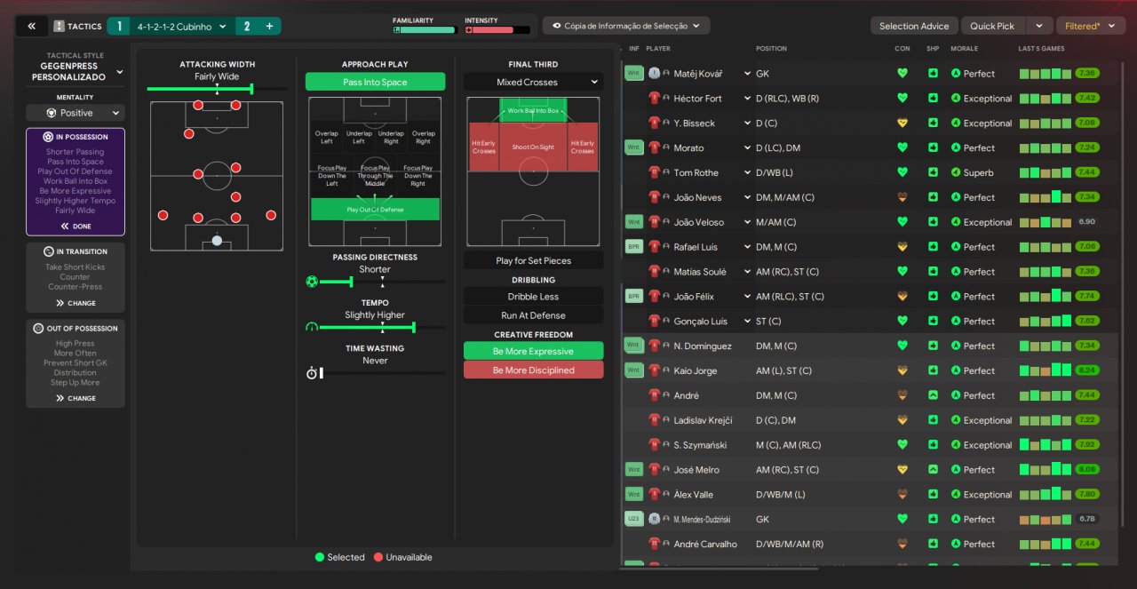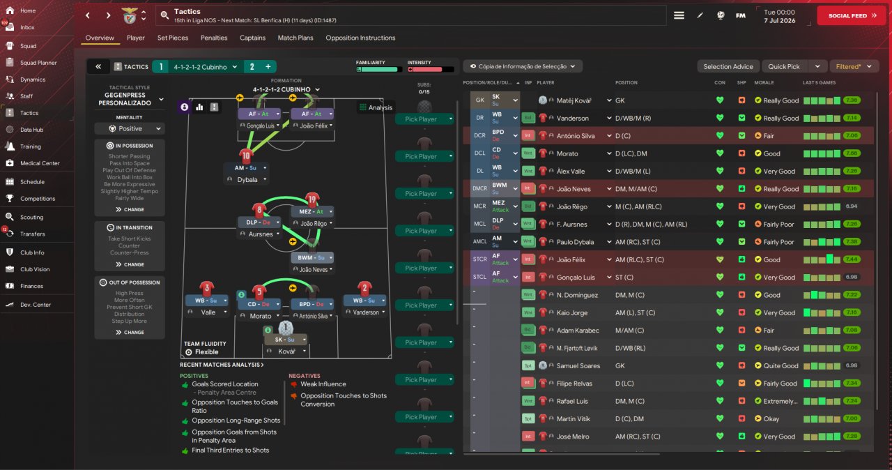 A variation of a 442 diamond formation on paper but that shifts into a 4222 with a square shaped midfield, this facilitates progression through the middle with quick short passes and highlights the attacking midfielder role.