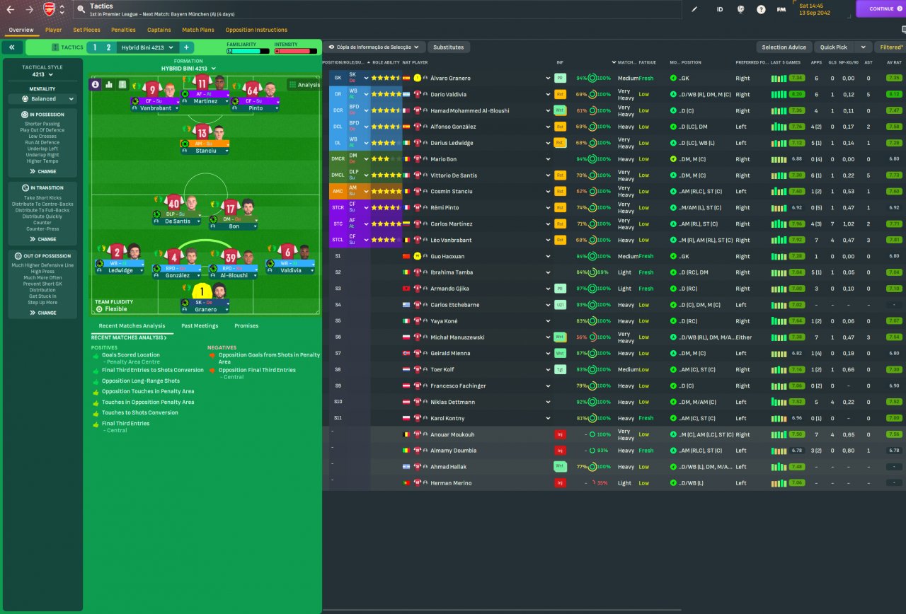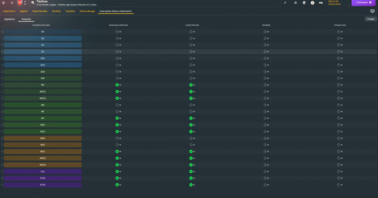 The tactic is very strong offensively and also is able to mantain a strong defensive performance. The two wing backs play a very important role on the build up of the tactic, and they stay wide, and to help the defensive structure of the team, there's a Defensive Midfielder on Defensive duty. The other Central Midfielder it's a playmaker which will also get you some deathly passes on to the front 4. About the front 4, well, you have a Offensive Midfielder on a support role, which helps the midfield both on the defensive as in the offensive part of the game. Add to that, you have 2 Complete Forwards, which will act as wingers (although not so wide), and 1 Striker which will get plenty of opportunities through out the match. All of the front 4 have the instruction to press in the off ball moment.