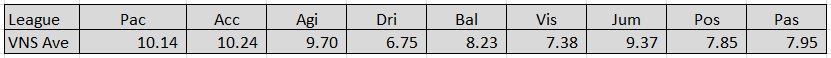My theory here is to look at the league averages for these 9 attributes. Then calculate the search values using the table above. Base value is league average rounded up to the next number ie 10.2 is 11. All attributes where the attribute value on the table is above 15% use the base value. For the attribute values 10-15% subtract 1 from the attribute table. For the attribute values 5-10% subtract 2 from the attribute table. Those below 5% don’t count.