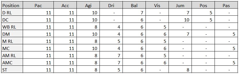 I am now rebuilding my squads for next season. Playing 3 different teams in vastly different comps in my current save. Holstein Kiel in Bundasliga 2, just promoted to the top league, A League side Macarthur, won this year and now in Asian Champions League, and St Albans, won Vanarama South and up to Vanarama National next season. This save has been going a while so started with many slow players, restructured when the attributes testing table came out and now realigning with the table above.
