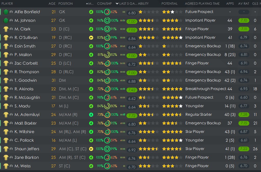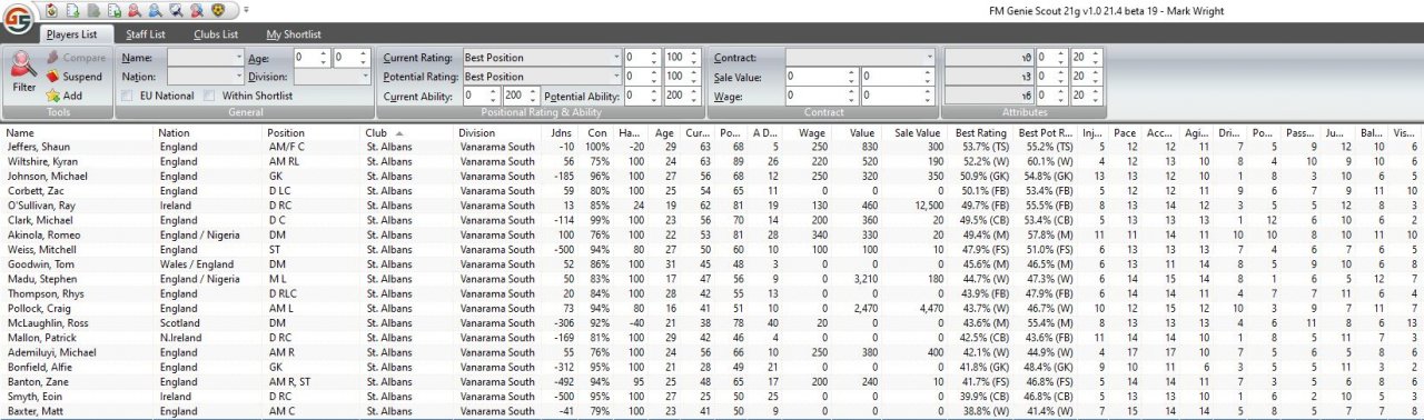 So there it is. Next step is to use my current test save, cull all the players that don’t meet the criteria above in terms of attribute value, buy in cheap players that do, so we have a squad of 20 ie one reserve for each position. I will post results when I get a chance to set that up.