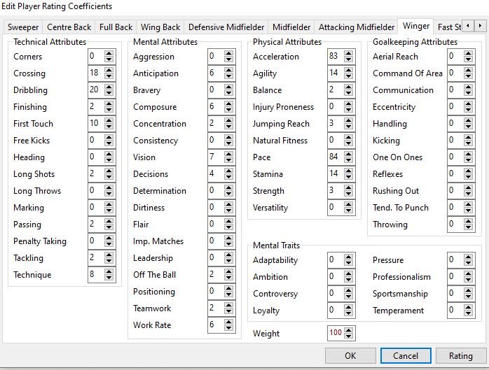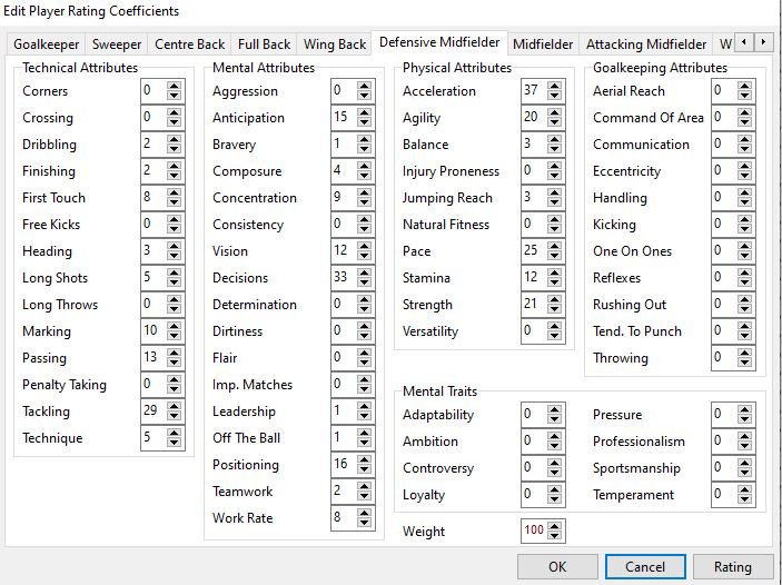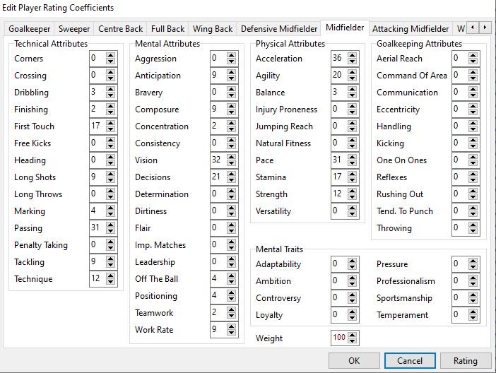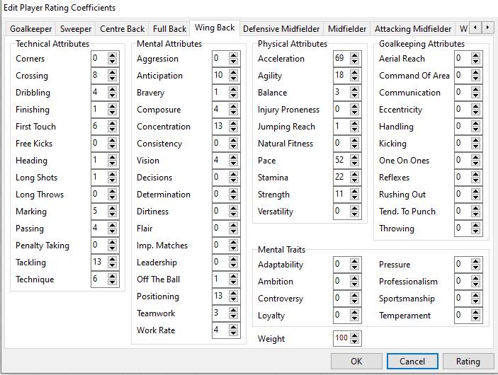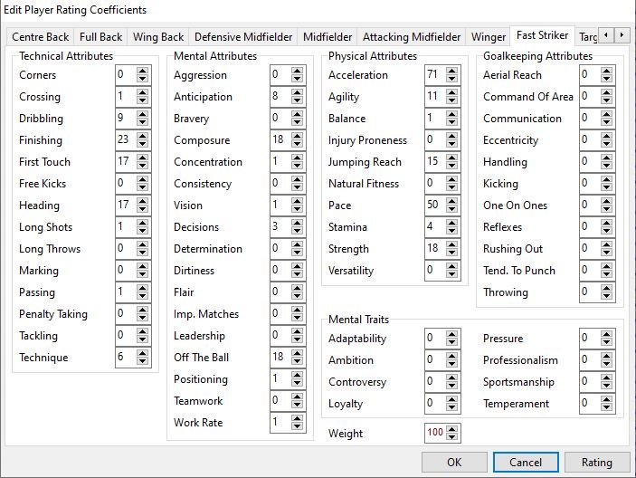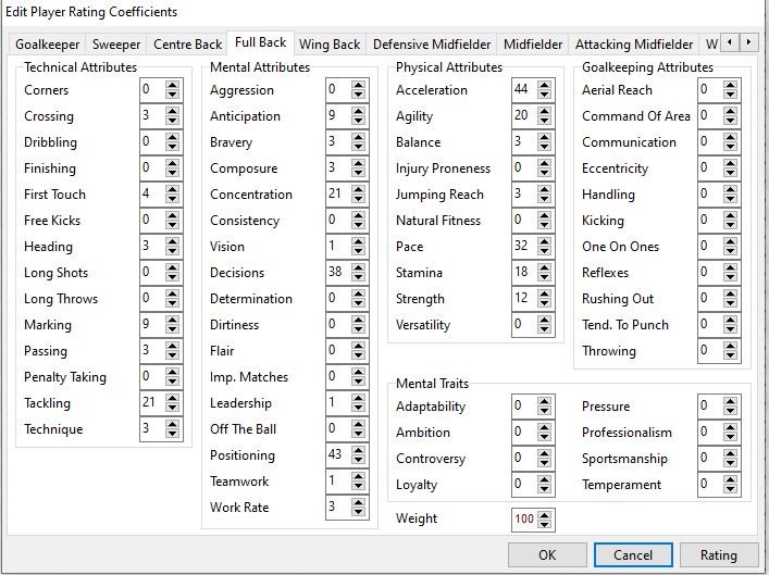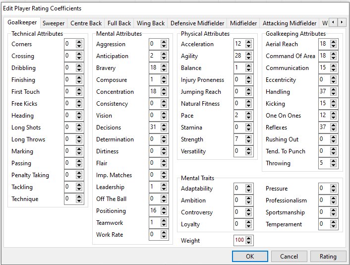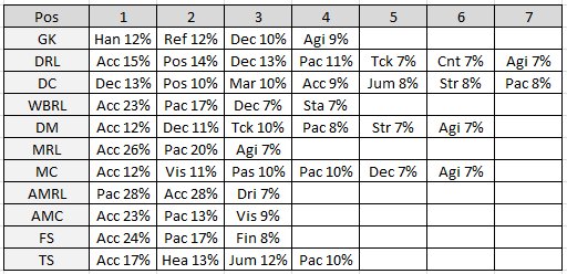 @Gracolas I have spent a bit of time refining the weightings and testing them and now think I have the most important attributes for each position. I have only included the ones above 6% in for each position otherwise it becomes a bit too large to fathom. But here goes