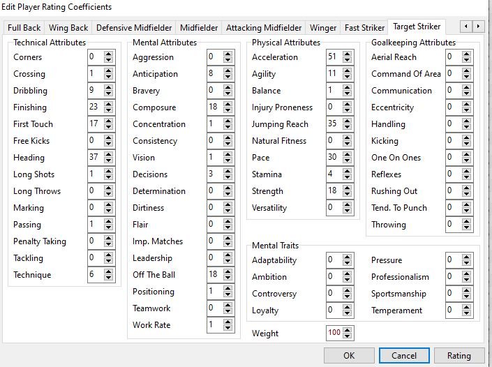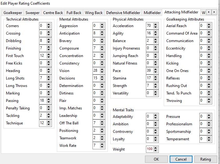 Mark said: @Gracolas I have spent a bit of time refining the weightings and testing them and now think I have the most important attributes for each position. I have only included the ones above 6% in for each position otherwise it becomes a bit too large to fathom. But here goes