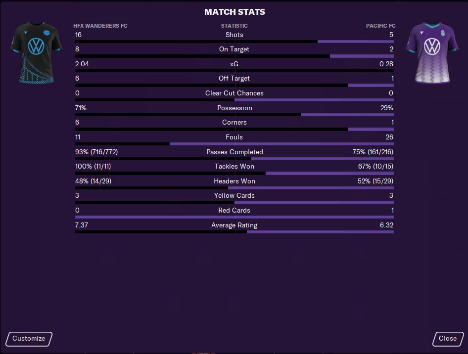 Stay on feet: I've always wanted my team to play clean football, with less cards. First and foremost, because I'm a softie and I don't want talented players to get hurt. On a tactical level, I want to avoid having to make substitutions based on suspensions or based on fear of suspesion. With this new approach, I had the chance to stop replacing both my DC in the middle of the game... and actually sub in my offensive players for more punch late game. Finally, the tactic is as "aggressive" as ever when out-of-possession, aiming at high-pressure and getting back the ball BETWEEN players instead of at their feet. You press, they have to make a quick decision. Since their tactic won't ever have the structure to help them make that decision (like Total Control does), most likely they'll try a pass that your players can intercept. Never need to go to the ground, you outsmart them. Clean team, still wins !