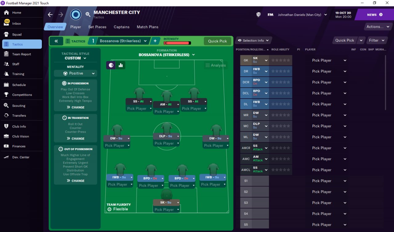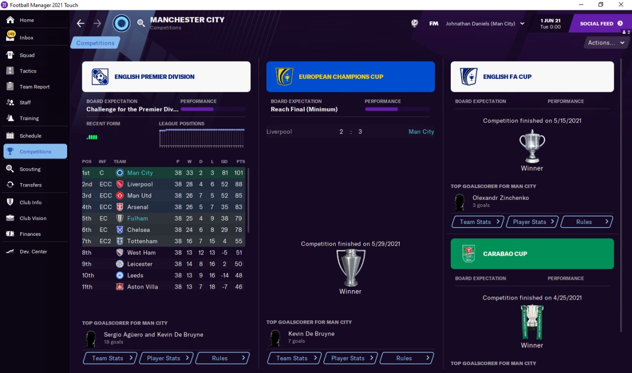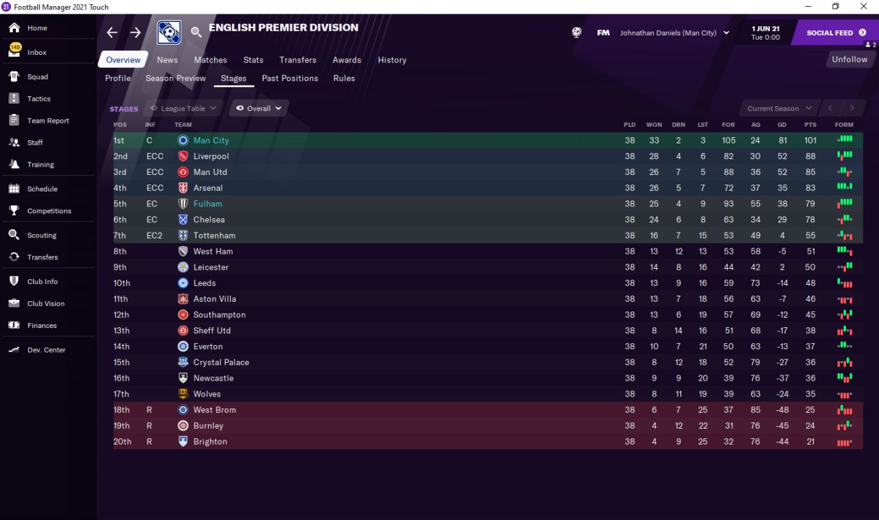 Its Bossanova but the Strikers are pulled down to Shadow Strikers with the Attacking Midfielders and the DLP is pulled up to the middle of the field. Man City 101 Points all cups, Fulham 78 points just missing out on Champions League football. Credits go to ZaZ for the setpieces as I can't optimize em