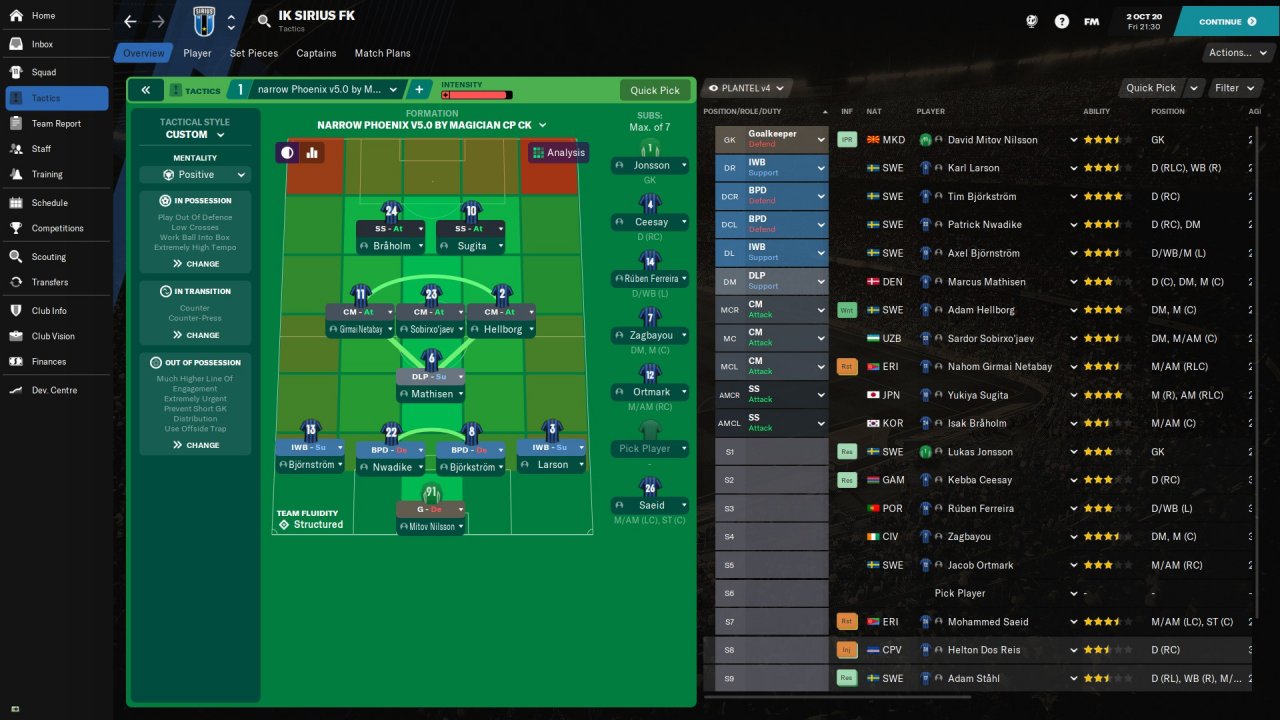 Not much to say, it's a phoenix tweak, so full credit to Magician, I just changed one position and role, and added a corner routine from other tactic. As Babemocni suggested me, and it counts a few goals on the season, the corners should be taken right corner-left foot left corner-right foot.