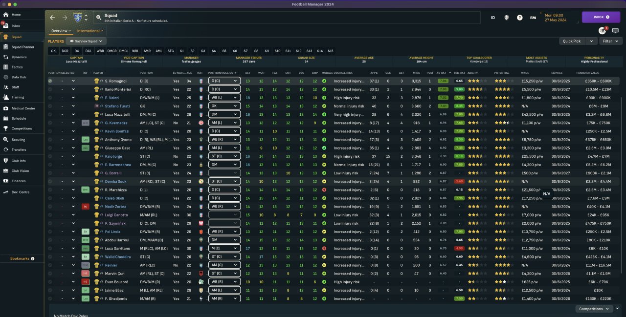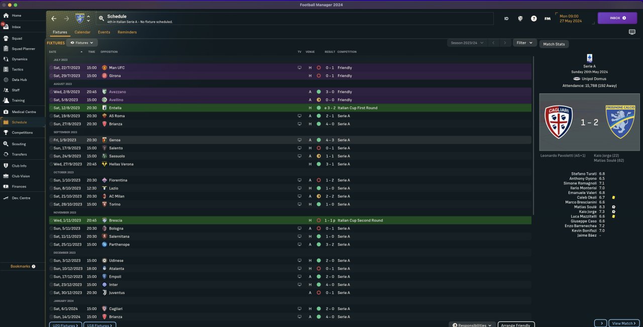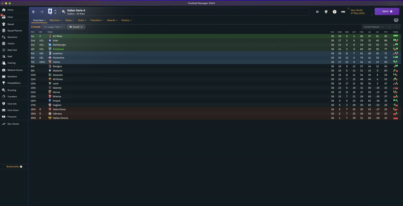 Switched to the Serie A with Frosinone, had to make several changes after a couple of tries. 4th placed, 36 GD, 77 pts