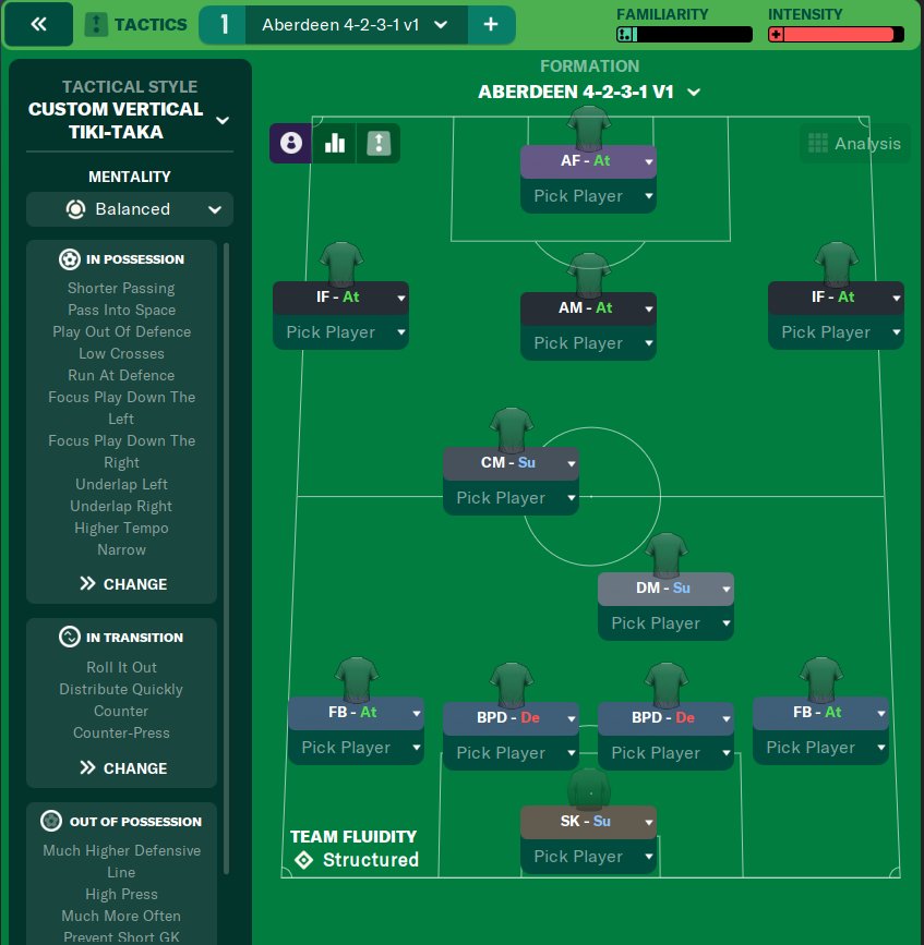 Tactic I developed during an save where I was playing as Aberdeen. It performed very well nearly winning the Scottish league in the first season losing the title on goal difference on the final day. It has been tested here using Man City where it performed well conformably winning the title.