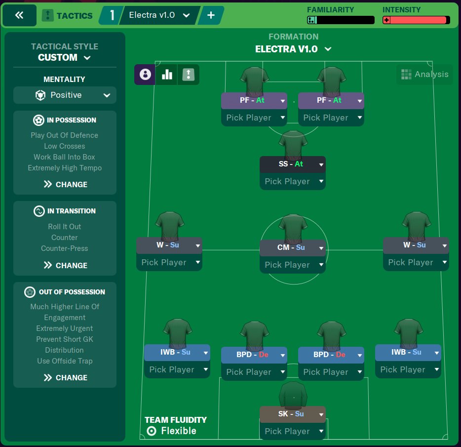 Electra is an enhancement of the hugely successful 4-3-1-2 Reactor that currently tops FM Base’s league of Underdog tactics.