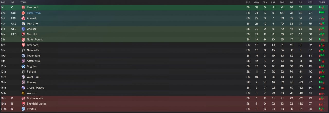 2nd in PL as Luton and scored 109 goal (top scoring team
