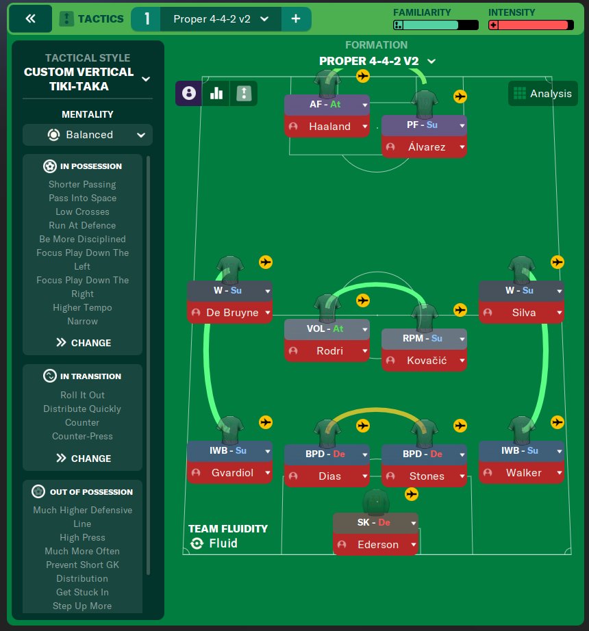 Version 2 of this 4-4-2 tactic tested using Man City. The result was a 101 point season and a UCL win. Slight changes were made to the striker partnership and the instructions in the final third.
