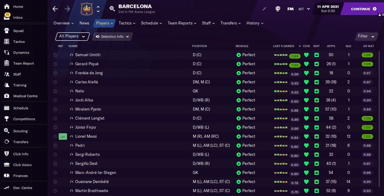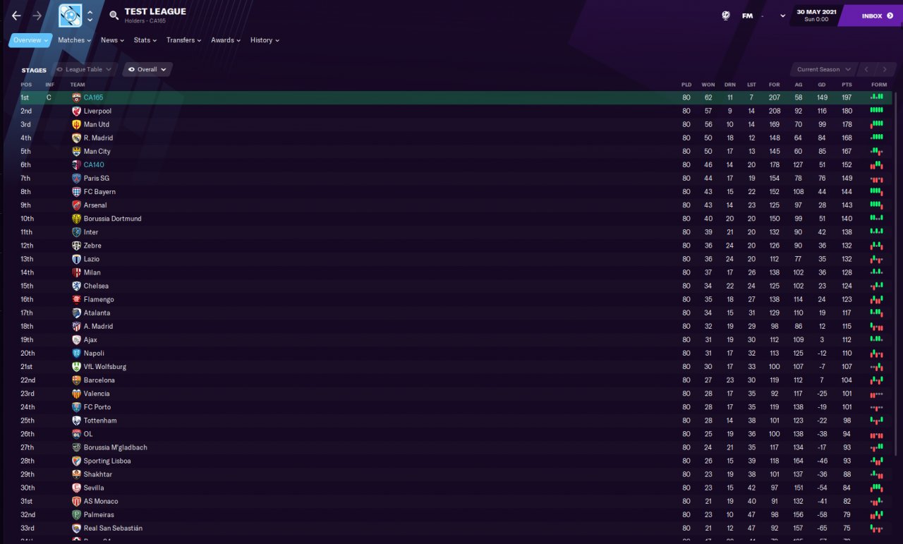 As you can see, the conditions are not unatainable at all. If I remember correctly, other tests like FM-Base also do most of these things, except they have less players and different teams (one with CA 160 and one with CA 140), while FM-Arena uses two teams with the same players (to get more matches per season). FM-Base also lets assistant manager pick the team, while FM-Arena picks players manually.
