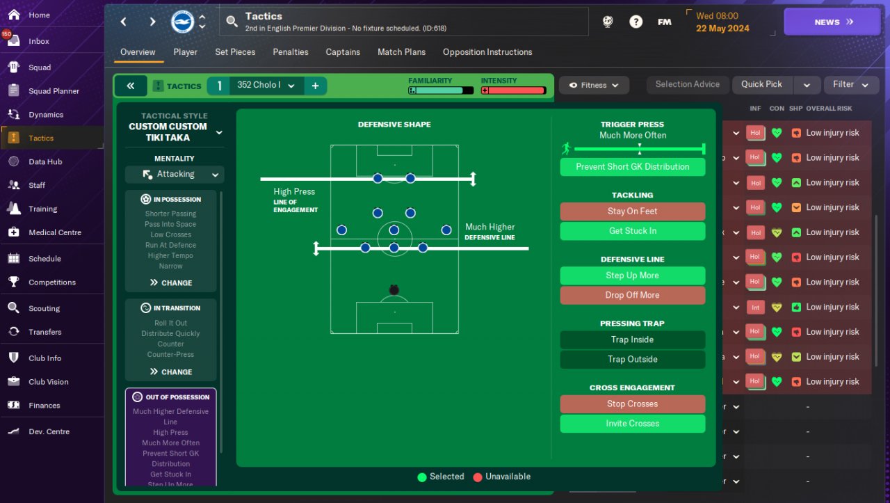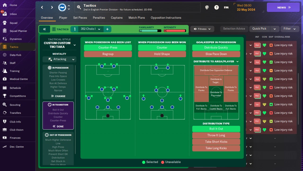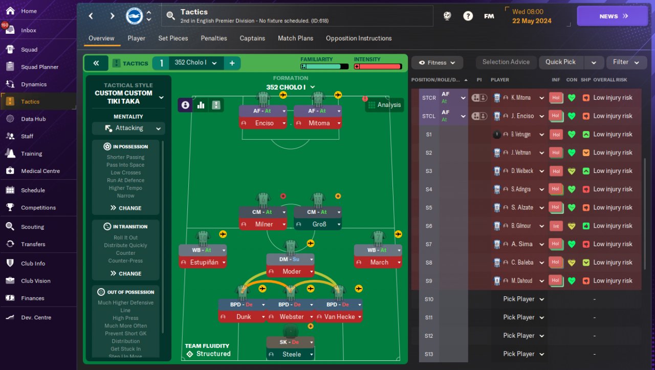 Back to my roots, the 352 tried to counter the weakness of the 352 in FM which is defending with only 8 players in the box which is pretty difficult also with no wingers so you get big burden on the defense, two strikers mark the two DM'S 90% of teams in FM play with double DM'S.