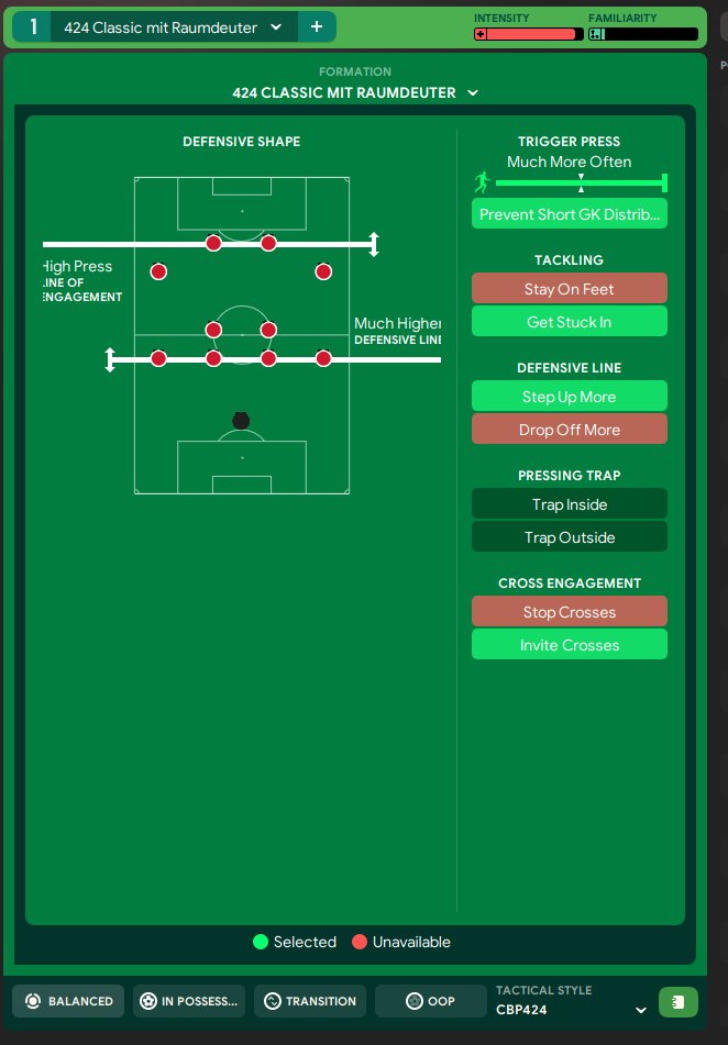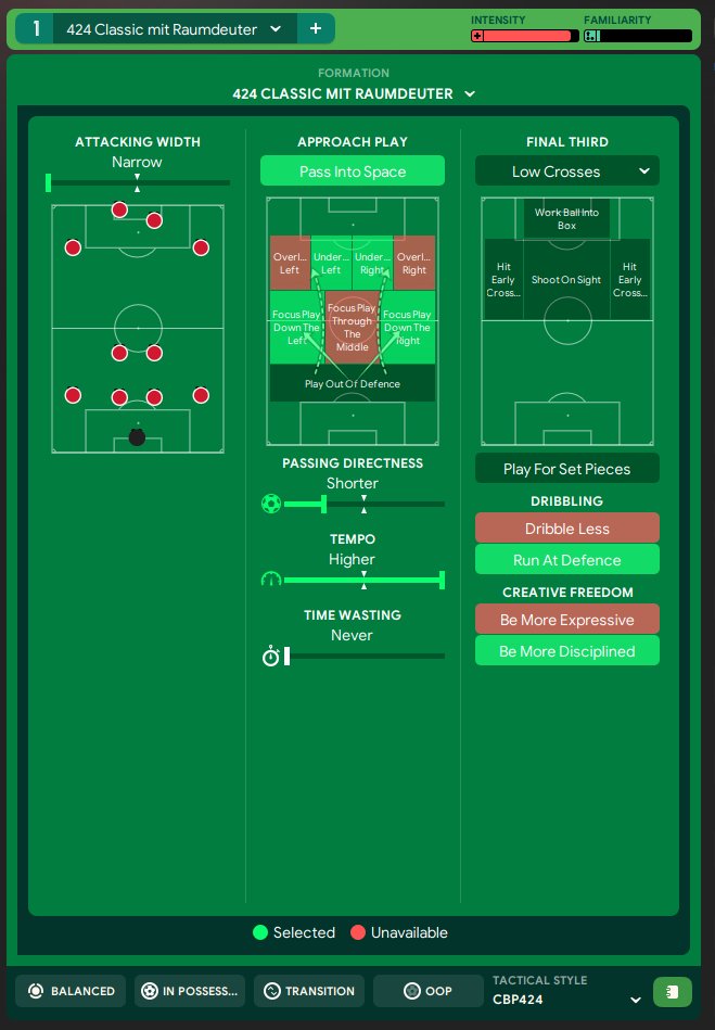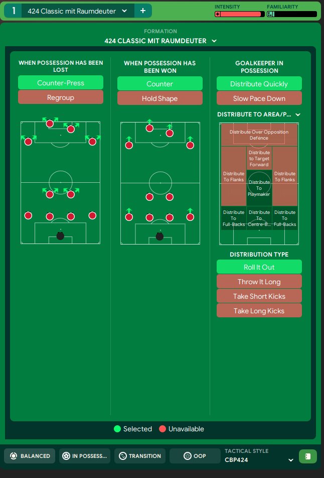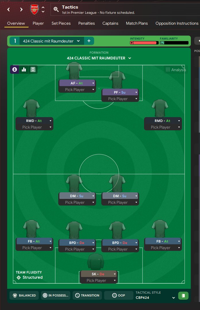 I changed this tactic only on the wings. i use Raumdeuter. everything else is like the original tactic. For testing i use Arsenal. I use the original Team without transfers. i went on holiday while using this tactic.