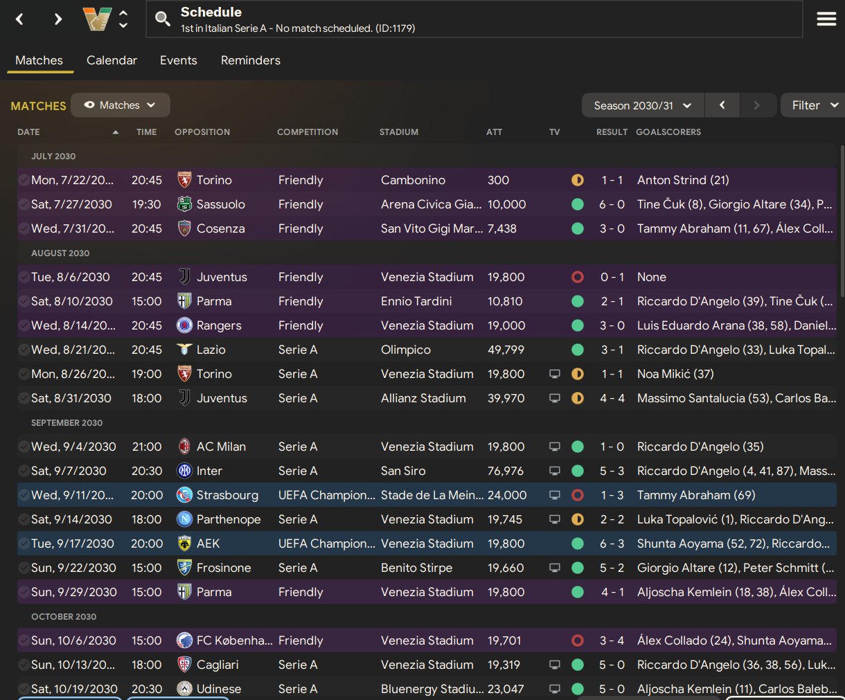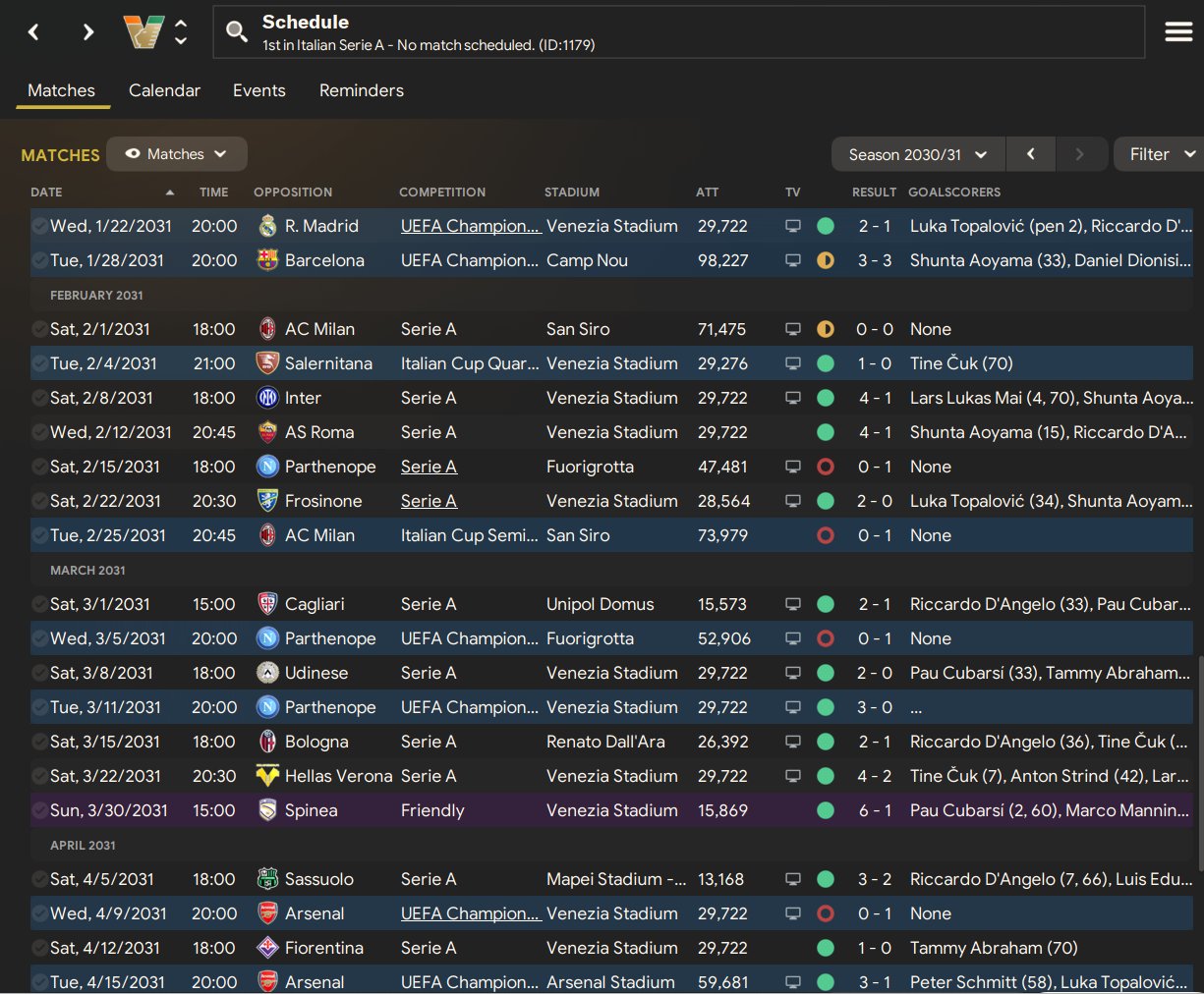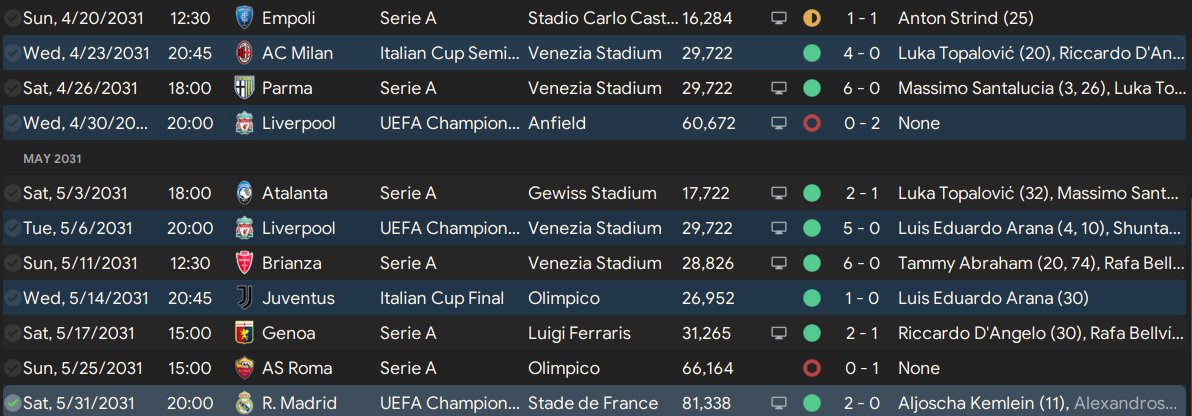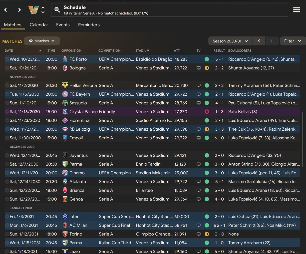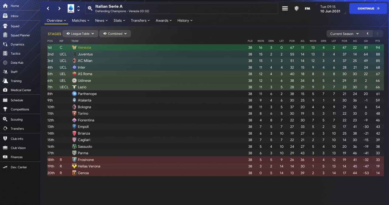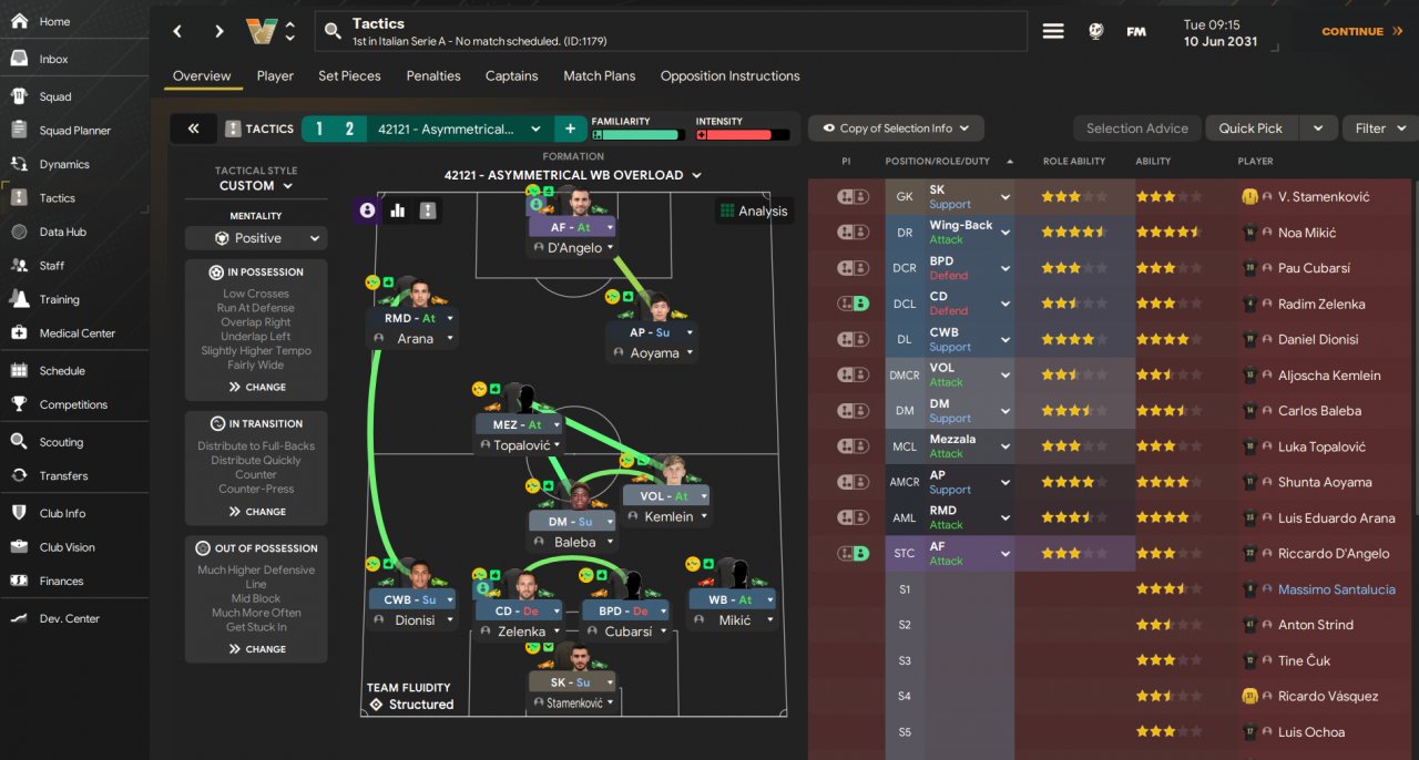 I used this tactic to win the quadruple with Venezia in my 8th season. This was my first year using this tactic. The main idea is to overload the center and left side of the pitch which allows the RWB to have constant free runs at the defense. There is a lot of flexibility in the attacking movements of the players, with roam from position on 4 players. The only player instructions are for the AP (Dribble More, Roam from Position, and stay wider).
