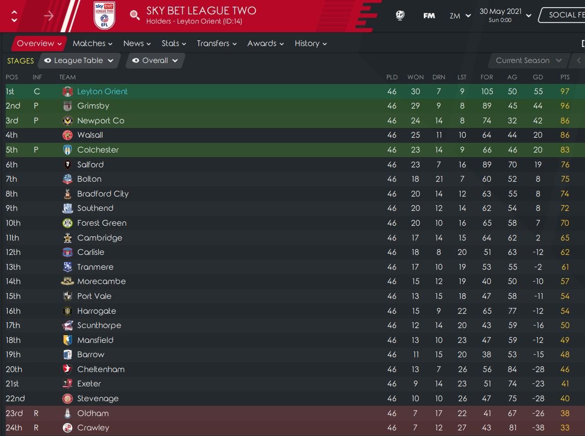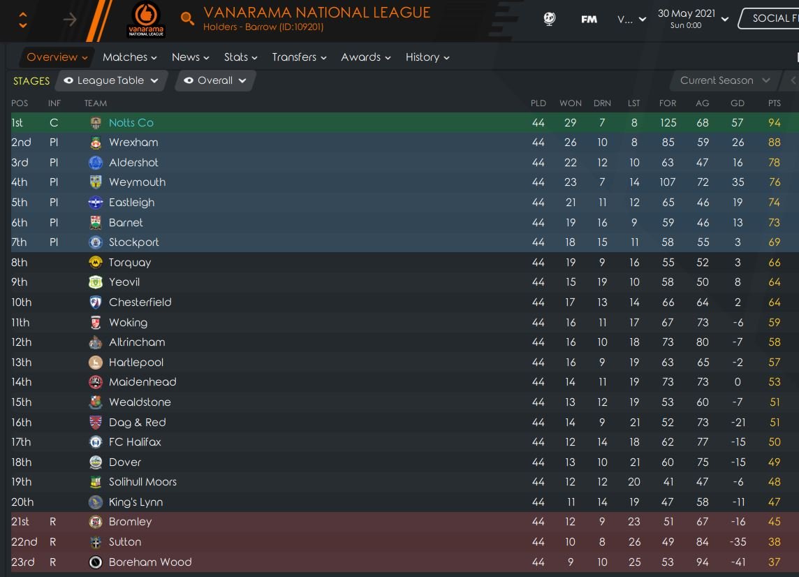 I am still very happy to have 3 tactics on the first page. This remains my favourite tactic. I started my last save for FM21 a month ago, called The Last Save - Hungerford. I was trying to put everything I learned into one last game and picked the lowest rated side in playable English football. We finished champions after 40 games with a record of 30 wins 5 draws and 5 losses, 21 points clear of second placed Havant. Our for and against was 97 to 35. We were predicted to finish 21st or last in the League. You can read about it on FM Scout. I have just signed a heap of replacement players and will see how far I get into the new season in Vanaarama National League before a start on the Beta of FM22.