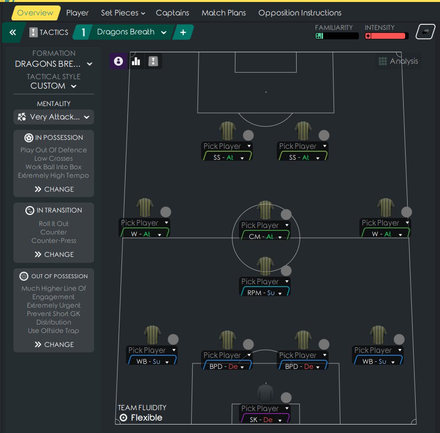 Here is my latest tactic - Dragons Breath. Developed after analysis of successful roles in the top 50 tactics on this site - which I will share over the next few days. Thanks to @ZaZ for starting this idea and the set pieces.