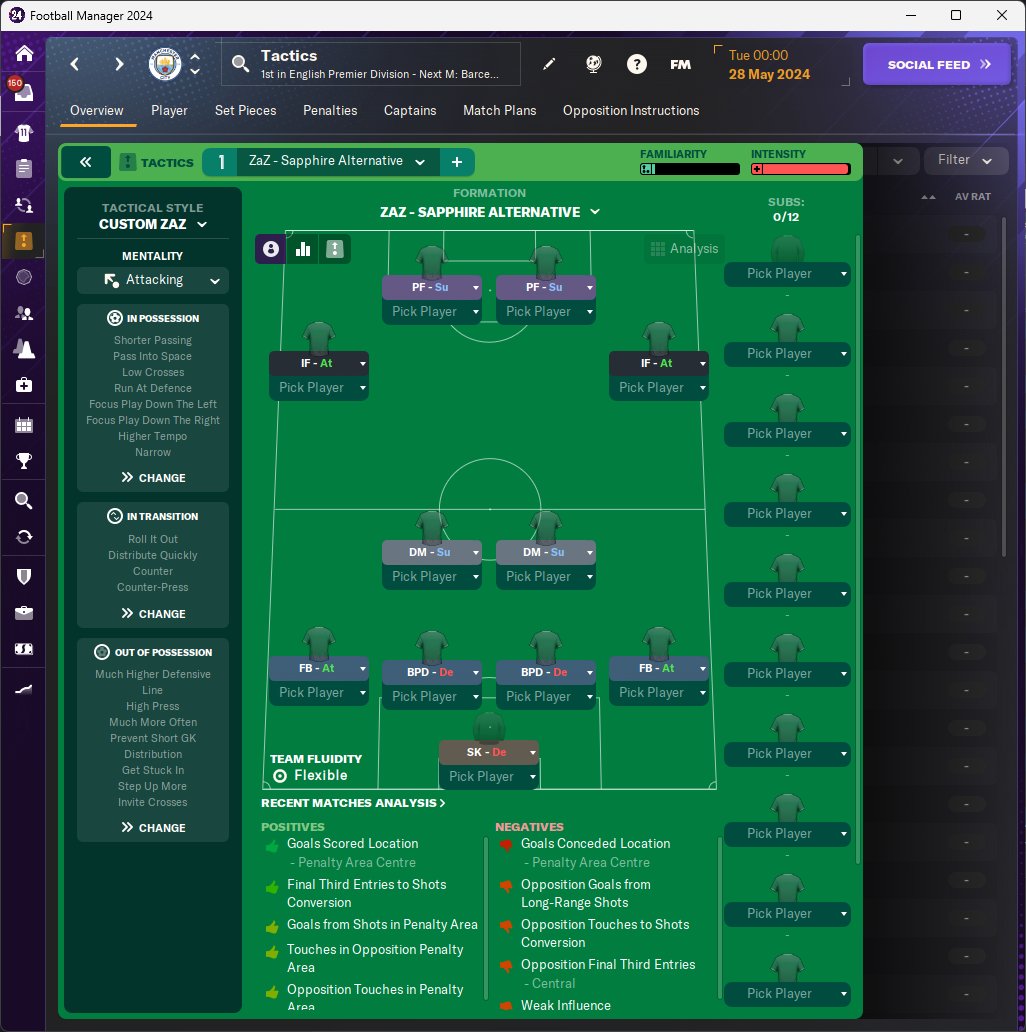 Testing an alternative to https://fm-arena.com/thread/12678-zaz-sapphire/, which is based on the top tactics from the table. Mentality is changed to attacking, and the DMs are changed to defensive midfielders, with the instruction to hold position. The idea is to have two players anchored to give others freedom to roam and be more aggressive.