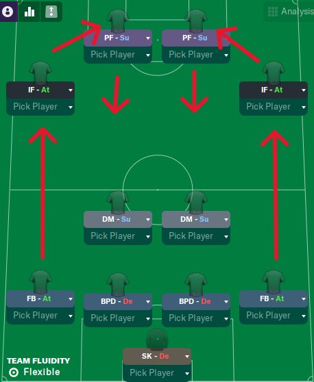 - The PFs drop back into the AM positions to play a more active role in the build up of attacks, drawing the opposing team's center-backs out of position. This movement creates opportunities for other players, particularly the IFs, to exploit spaces behind the defense.