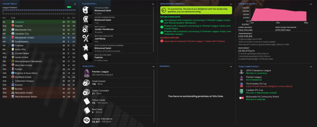 102 pts with Liverpool, winning the PL, CL, Carabao Cup and Community Shield. Top scorer was Salah was 57 goals