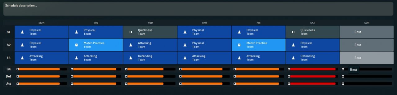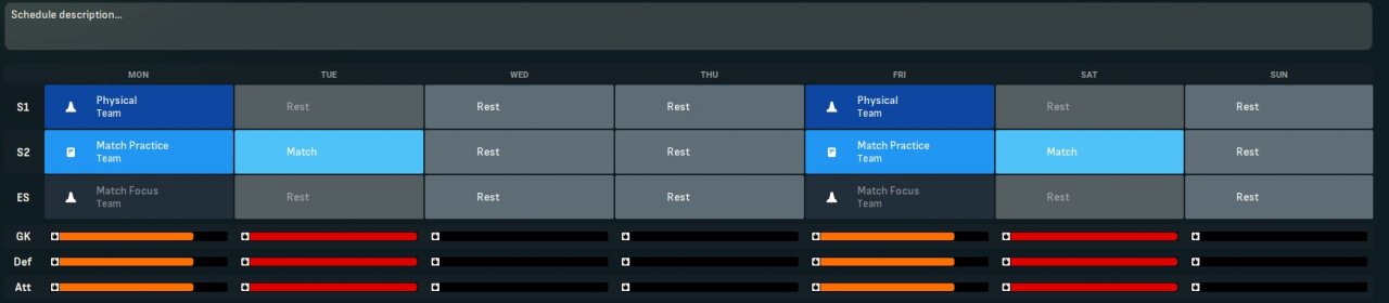 I use a similar schedule. I don't have as many physical, which is probably a mistake and don't use match practice and physical on the same day. It's basically physical, defence and attack every day with two march practices a week and 3x rest the day after a game. It's your schedule from 22 or 23 with the rest that yourself and max came up with.