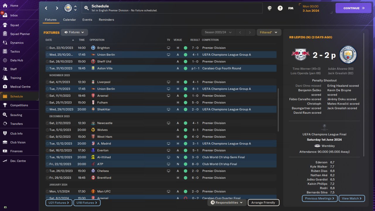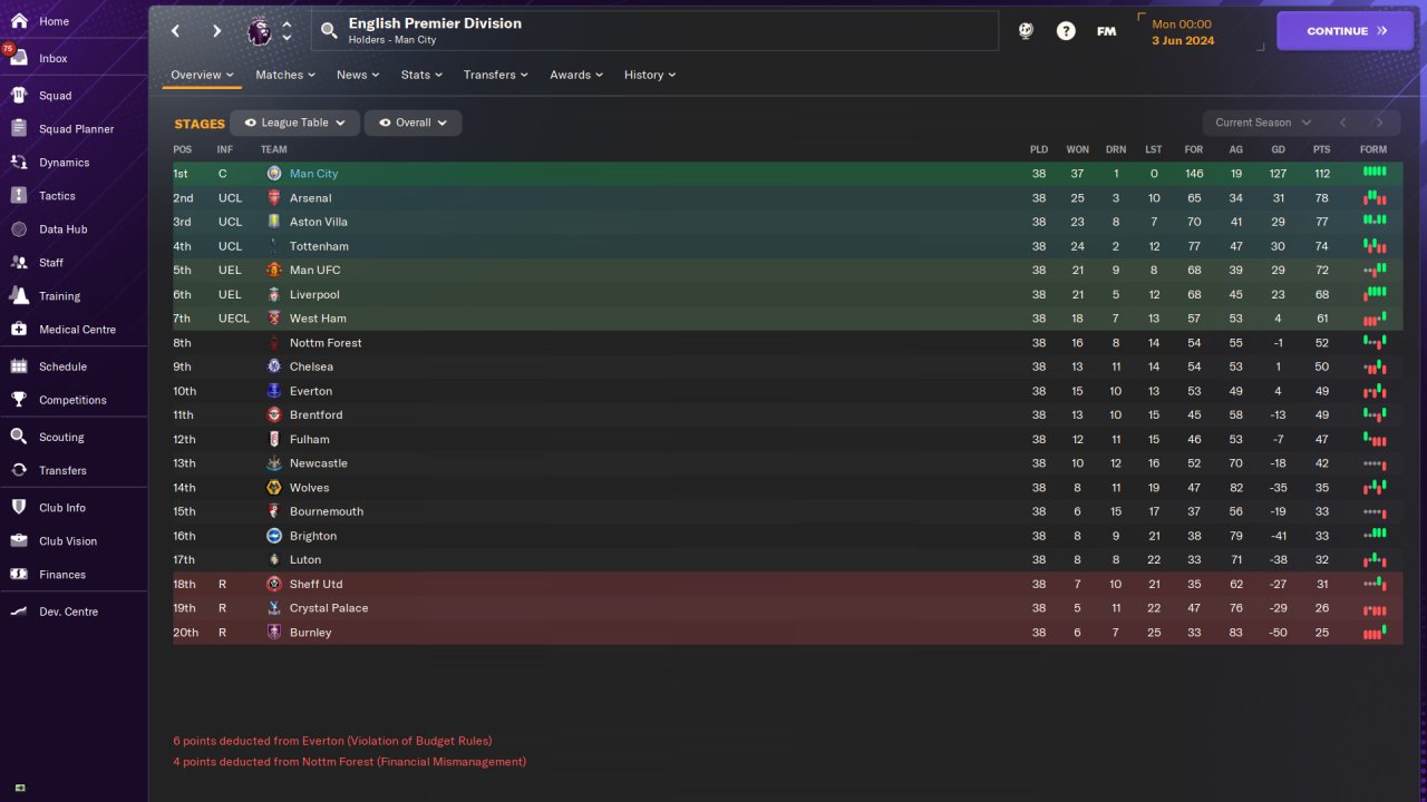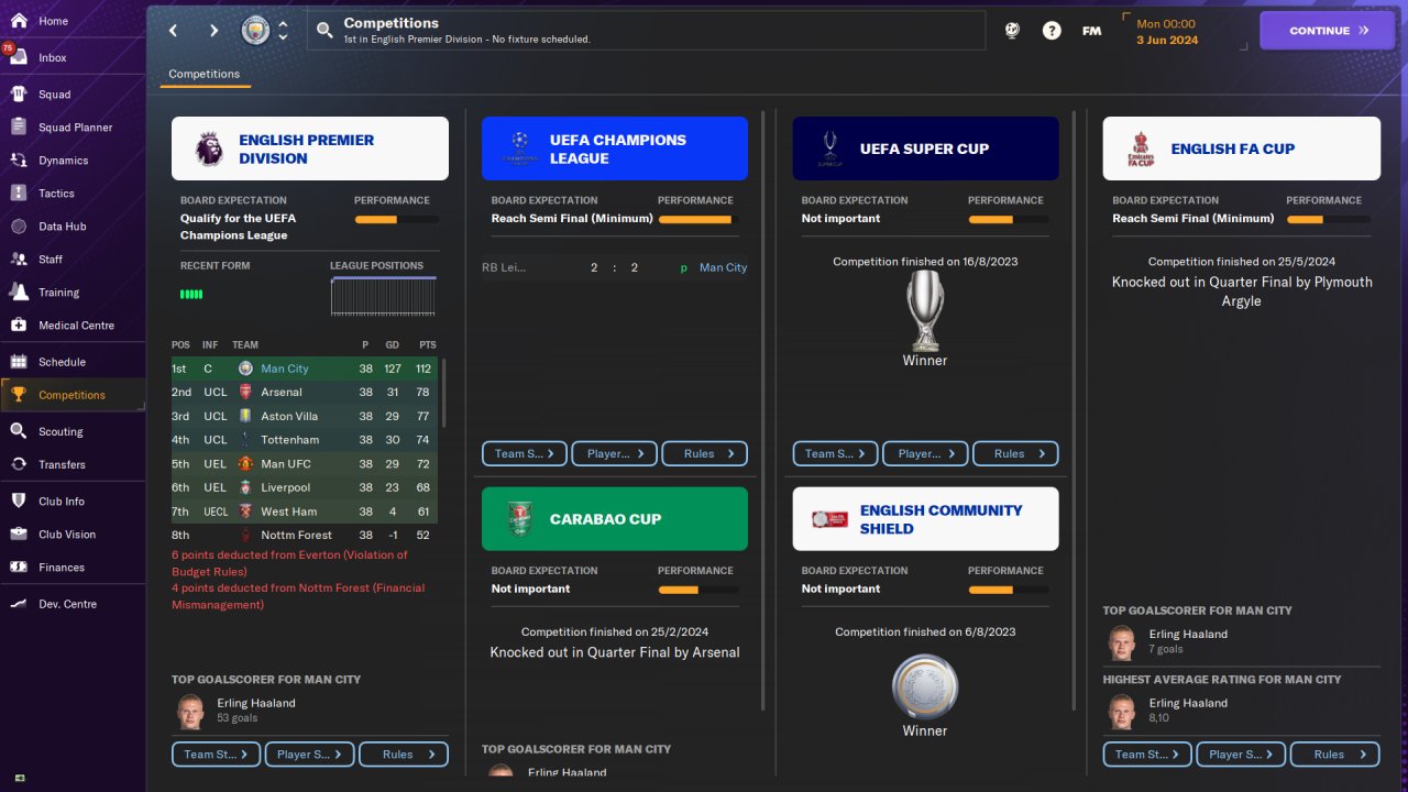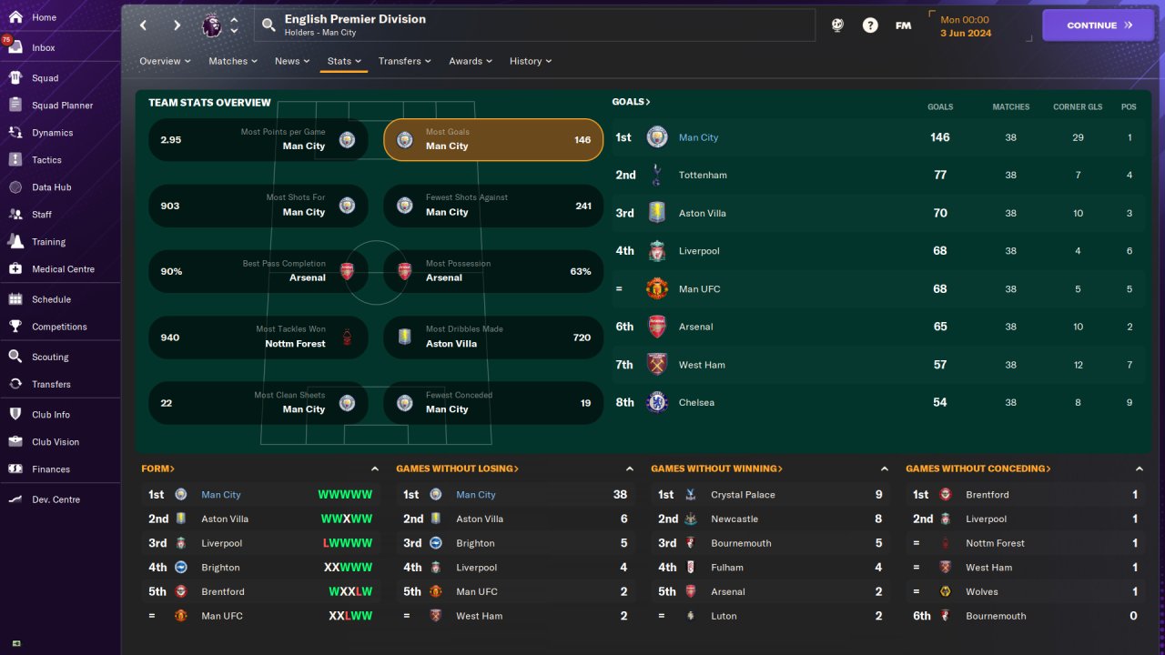 Man City Premier League first season: 37 win, 1 draw, 0 loss, 112 points. Goals scored:146, goals conceded:19. Won the Champions League. Played on holiday mode. No transfer.