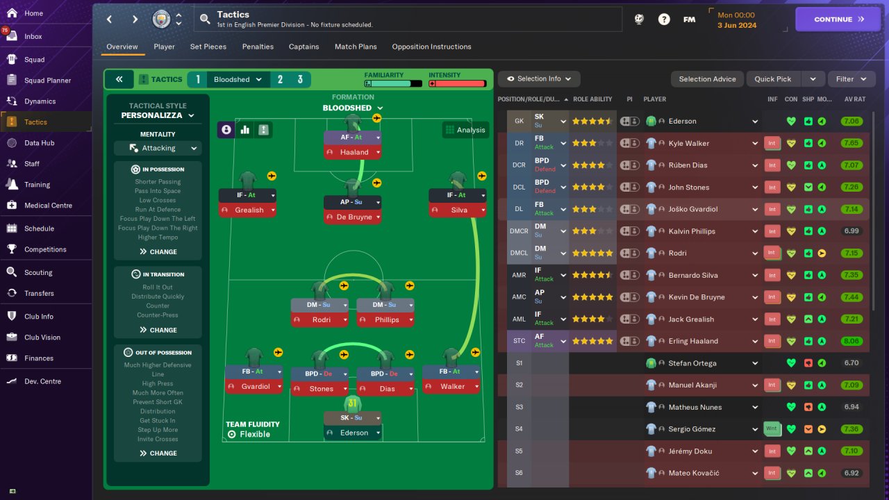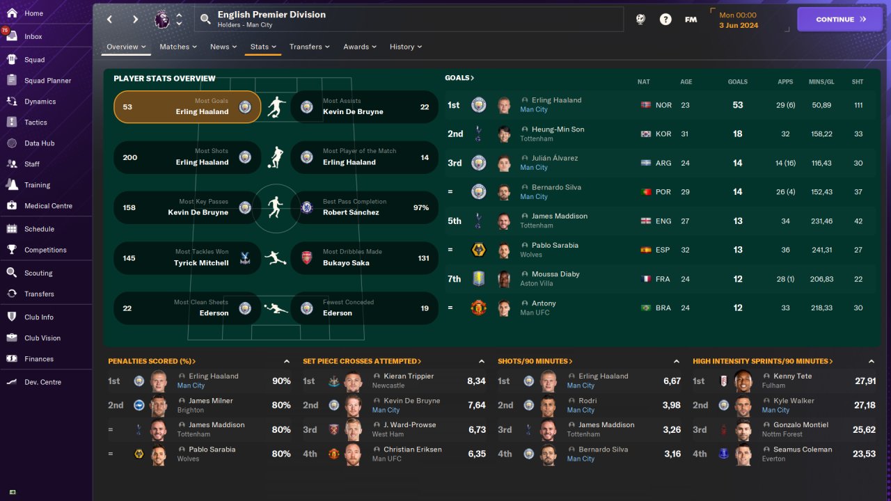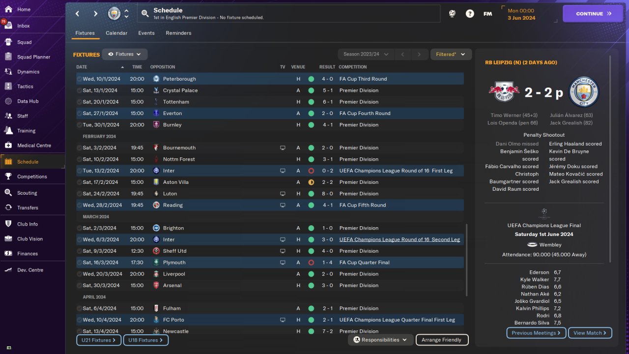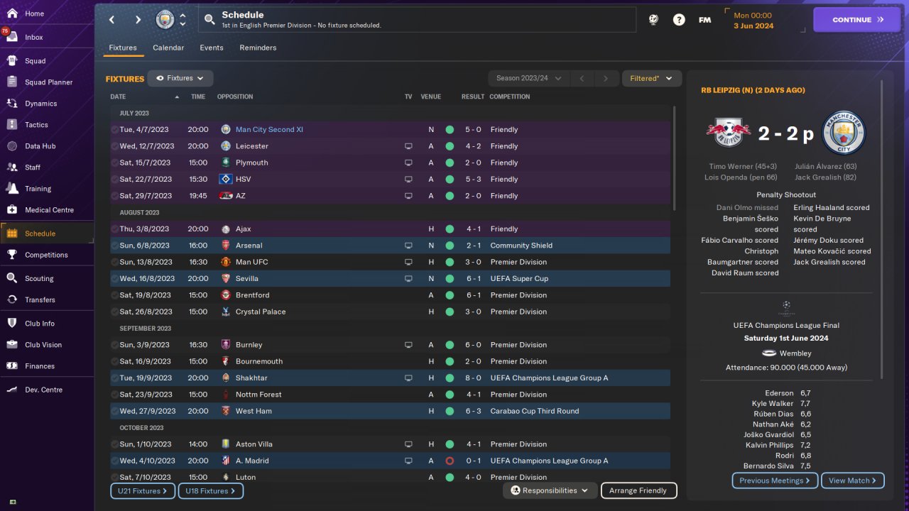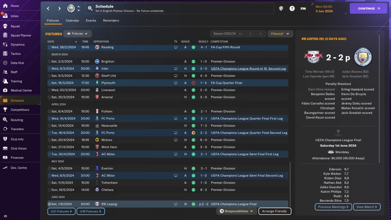 Man City Premier League first season: 37 win, 1 draw, 0 loss, 112 points. Goals scored:146, goals conceded:19. Won the Champions League. Played on holiday mode. No transfer.