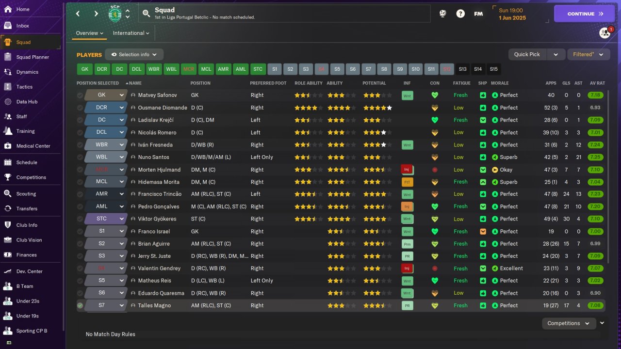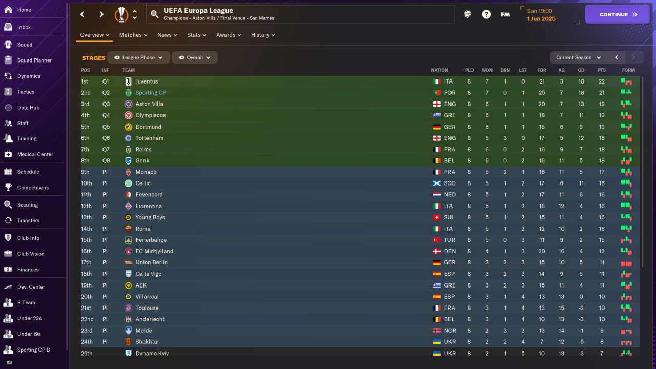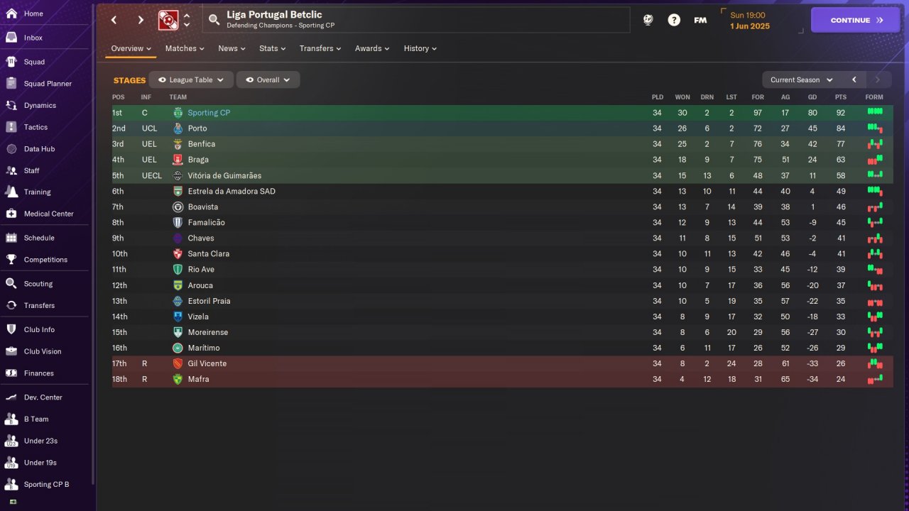 In addition to the 424 formation I posted in another thread, I had also created a 343 formation with similar settings and achieved very good success with Sporting CP in second season (albeit not as much as with 424). Won the league with 92 points (just 2 draws and 2 losses), and reached the final of the Europa League, only losing on penalties to Villa. Also, was second in the league stage of the Europa League. I don't think the team is much stronger than the initial Sporting squad, as I had to sell several players early in the first season when I didn't know yet how to deal with unhappy players.