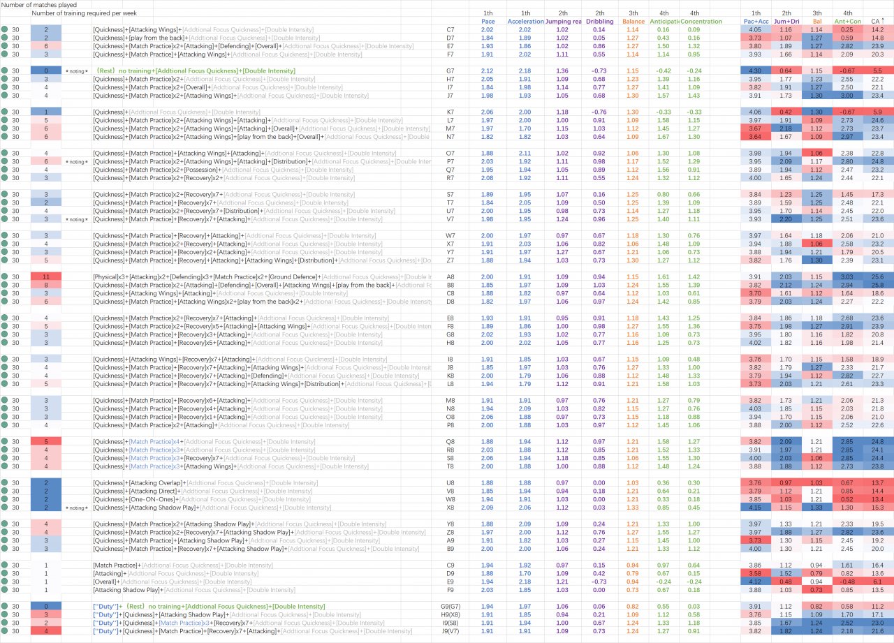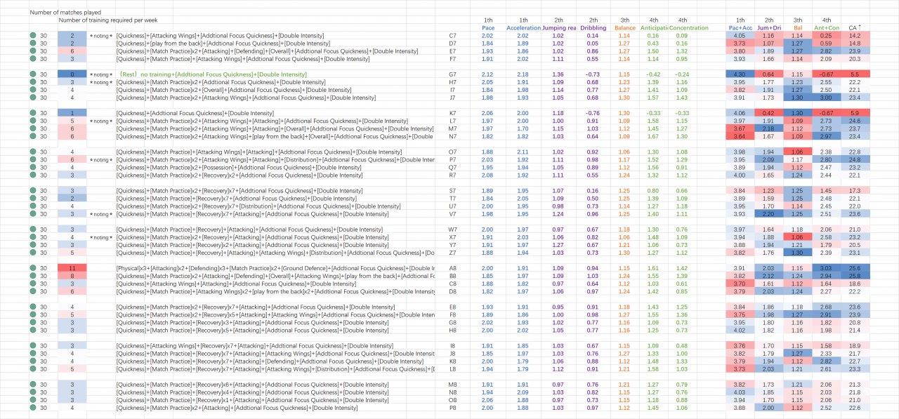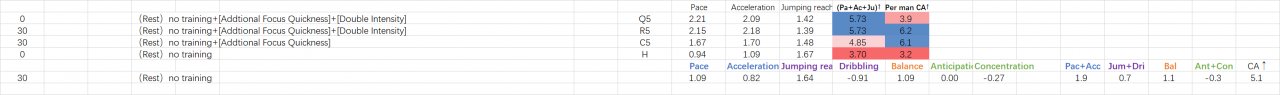 1. Inadvertently found in the test: [Quickness]+[Match Practice]+[Recovery]x7+[Attacking]+[Addtional Focus Quickness]+[Double Intensity] (V7 in table)
