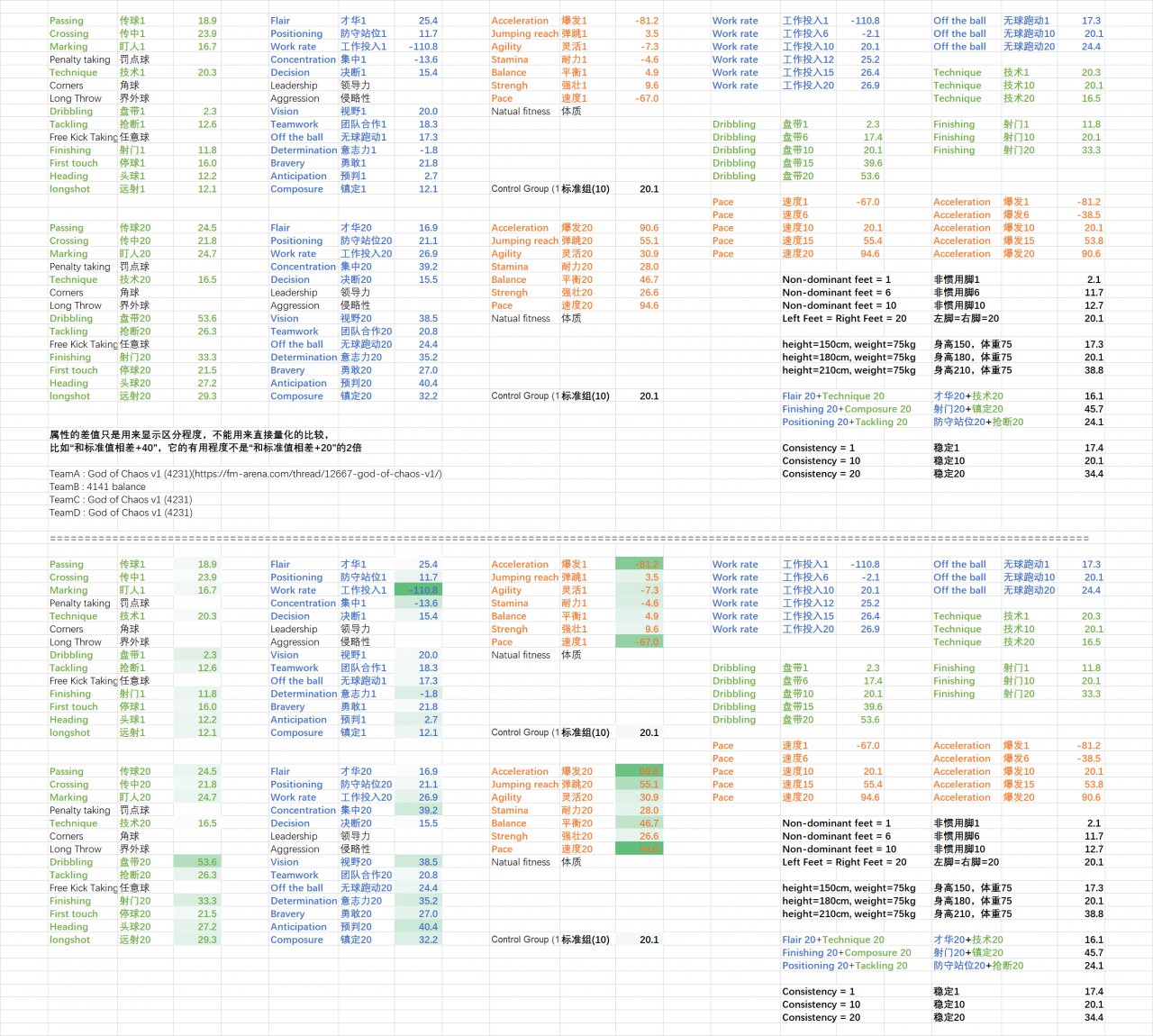 The test conditions are the same as before, all attribute 10, Professionalism 20, ambition 10, work rate 10, PA 200, age 20, height 180cm, and training facility level full. I increased the number of each tests by one more time, to four seasons, to slightly reduce the error , Since growth is not very volatile, 3-4 seasons is enough to narrow down the error caused by random
