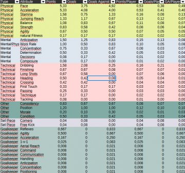 I then took this attribute value and multiplied it with how much the respective training schedules raise or decrease said values. So if a schedule increases Speed by 2, it will get the value of 10,66 as ten players are affected, whereas an increase of 1 in Reflexes would only increase the value by 0,66 as I haven't found an exploit to play with two goalkeepers