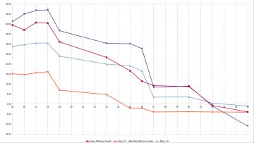 This I labelled "Effective Growth", i.e. growth that will affect results and not just fluff up numbers. If we divide the CA growth from this effective growth, we also get an efficiency value -- how much does an increase in CA generate in value.