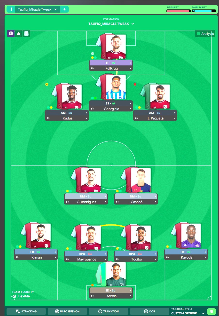 This is a tweak of the popular Taufiq Miracle tactic, switching the wingers to CAMS for a more central attacking style of play, relying on fullbacks for width.