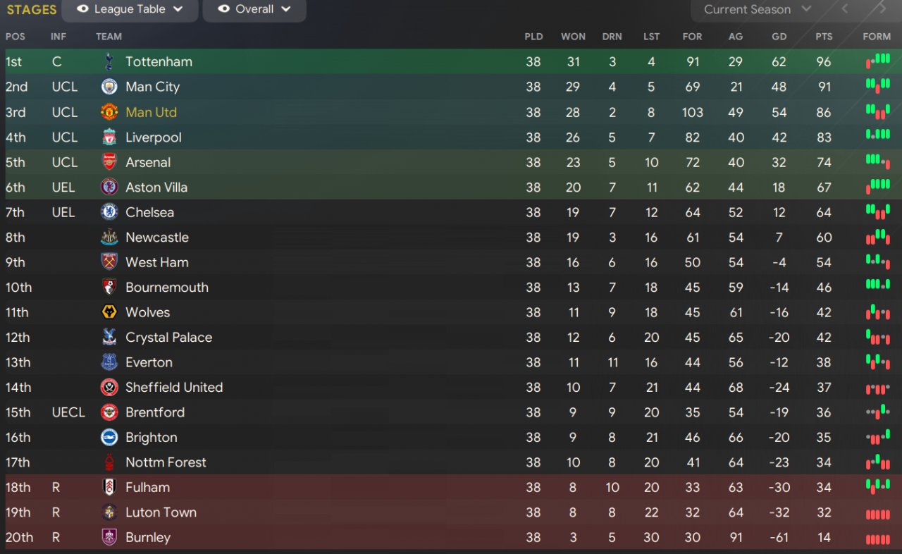 Nice tactic, 84 points sometimes enough to win the title but Spurs have had a blinder! Lost League Cup final to Brentford(!) and lost CL semis to PSG