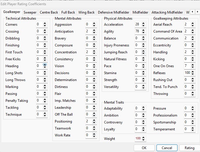 I have tried your ratings with minor tweaks to centre back / full backs. I used the editor to add around 25 players to ipswich town who had market value under 7M with the highest current ratings according to the ratings file. Didn't touch anything no set piece no staff etc. simmed the whole season with the highest rating tactic here won the PL with 85 points, the purpose was to see if it can win the PL with undervalued players using this file, here are the relevant screenshots First screenshot was taken after first season, all of the players added were under 7M transfer value Expand
