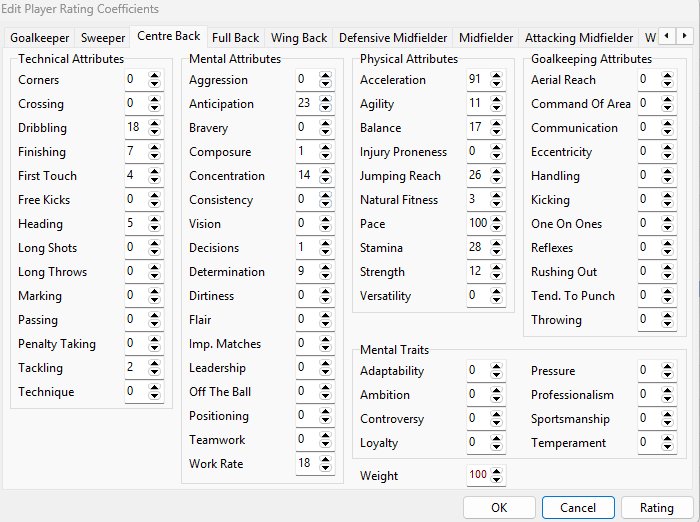 I have used the same values for all positions at the moment, and only for CB, FB, DM, W and FS positions - thats the formation I am using. I will add more later.