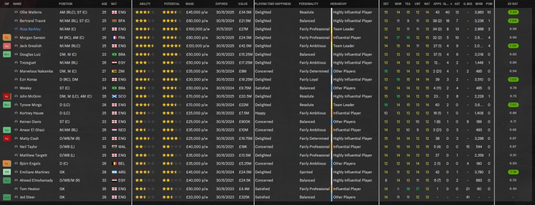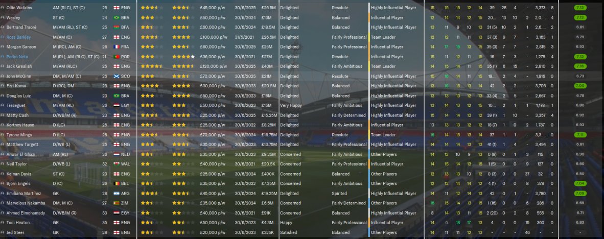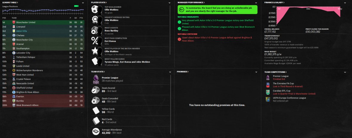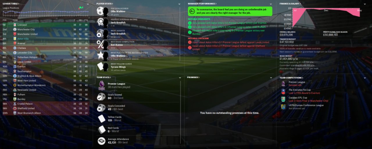 Aston Villa finished 4th, predicted 18th. No cup finals, but lost a semi to Man City. Watkins top scorer with 28 goals in all comps.