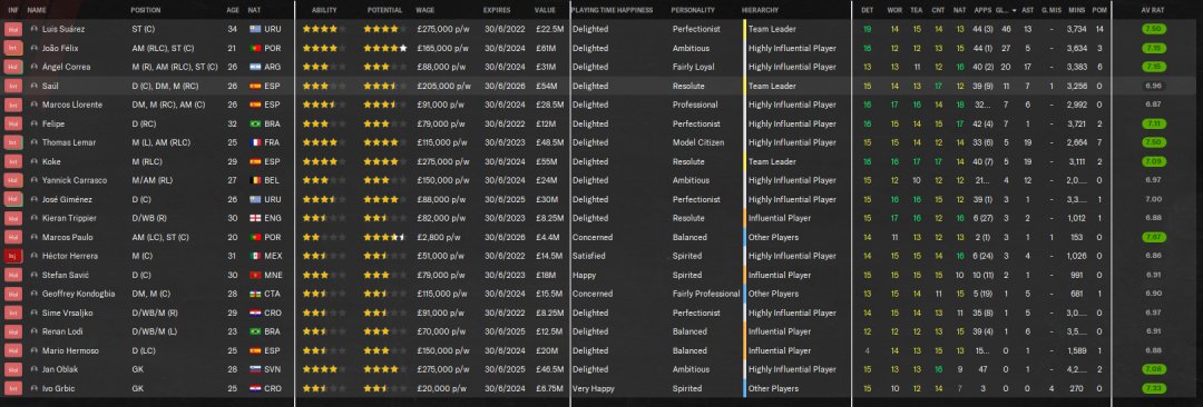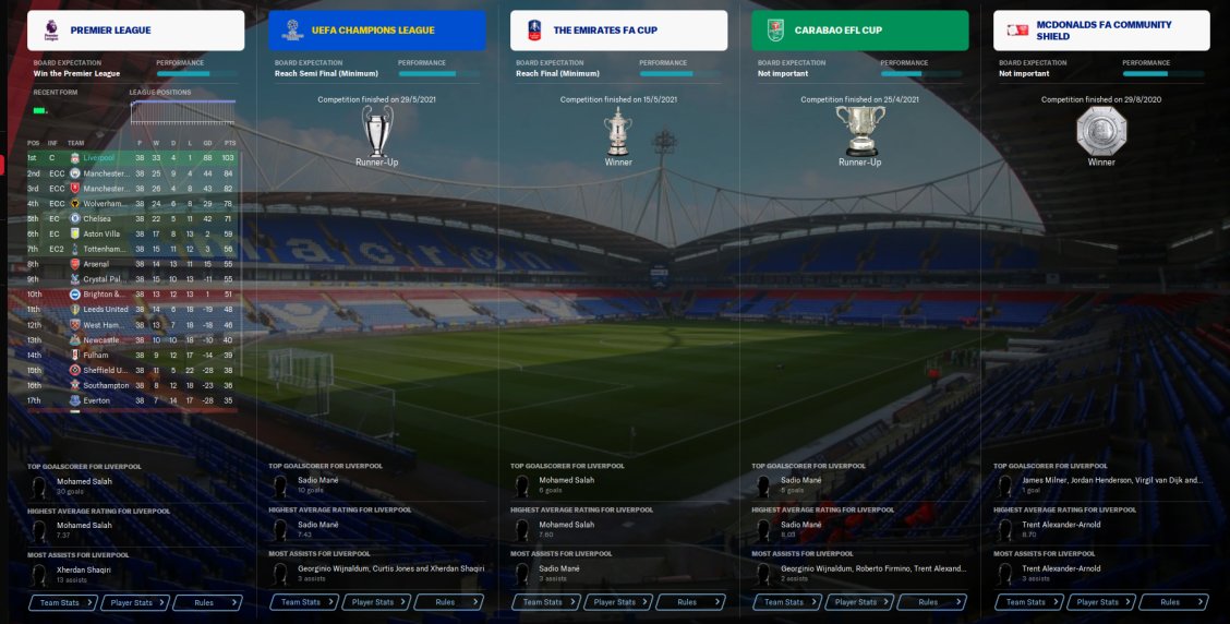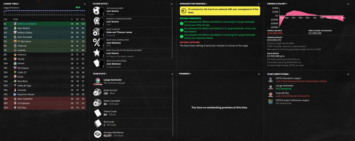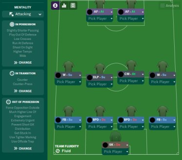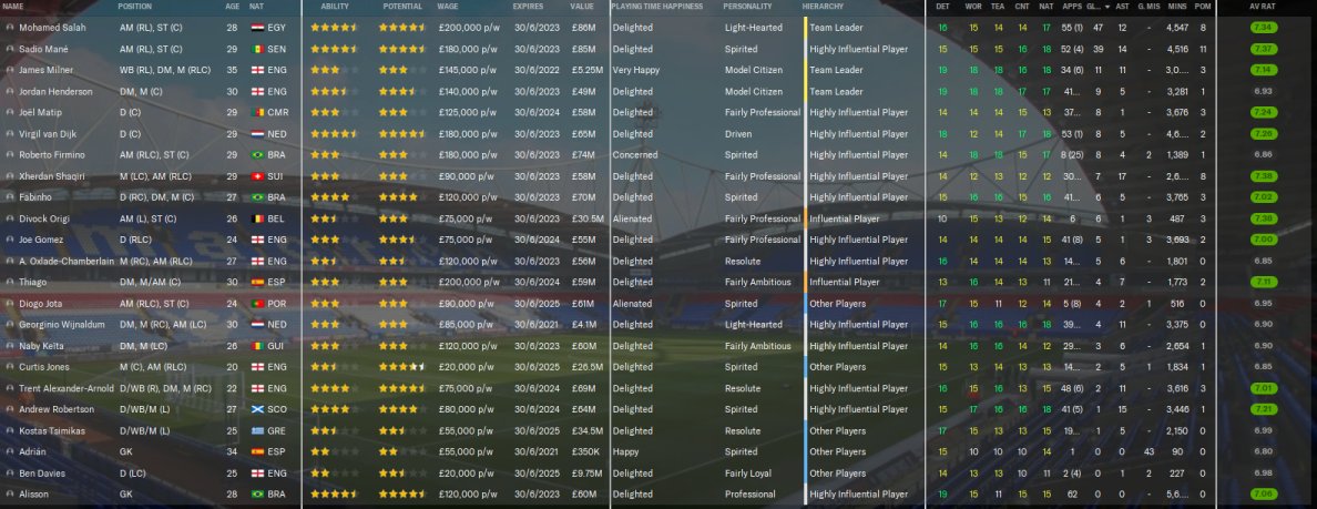 An attacking version of The Confession 442. AM in charge of team selection and training. FRMTE used to make the test manager unsackable. That's it. Nothing else used. No freezing fitness or boosting morale. As you can see from the test results, it achieved some pretty remarkable results. 108 points with Liverpool, 114 points with PSG, all 389 league games won. 103 points with A.Madrid and a 3rd place for Villa. Top scorer in each test scored 40+ goals