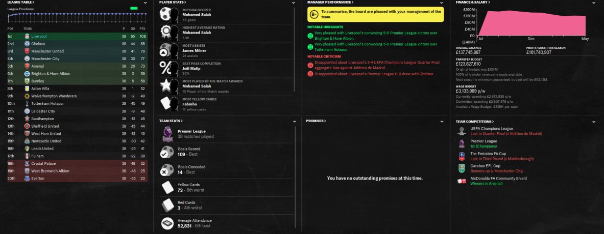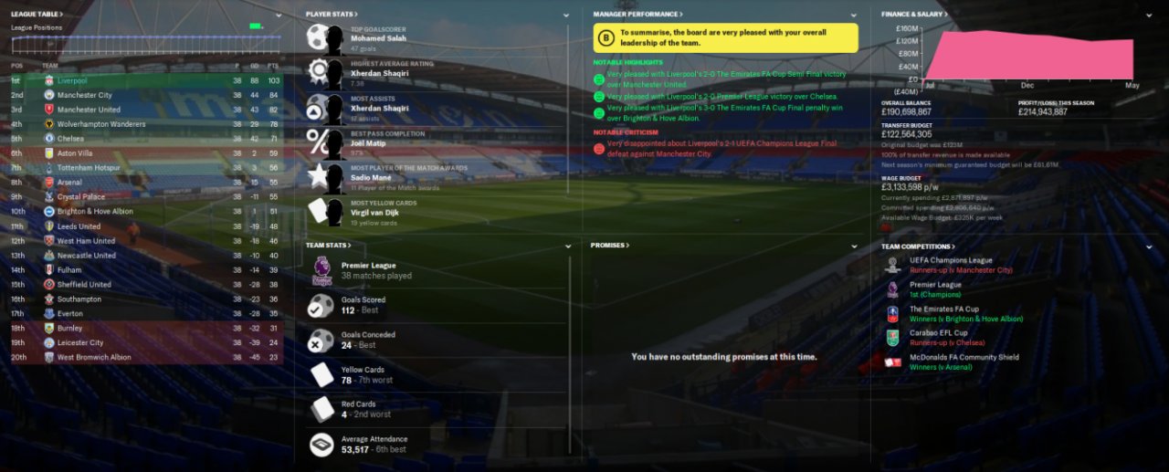 Liverpool won the league with 103 pts, losing only 1 game. Won the treble and reached the final of the other 2 cups. Salah scored 47 goals in all comps. Best attack and best defence in the league