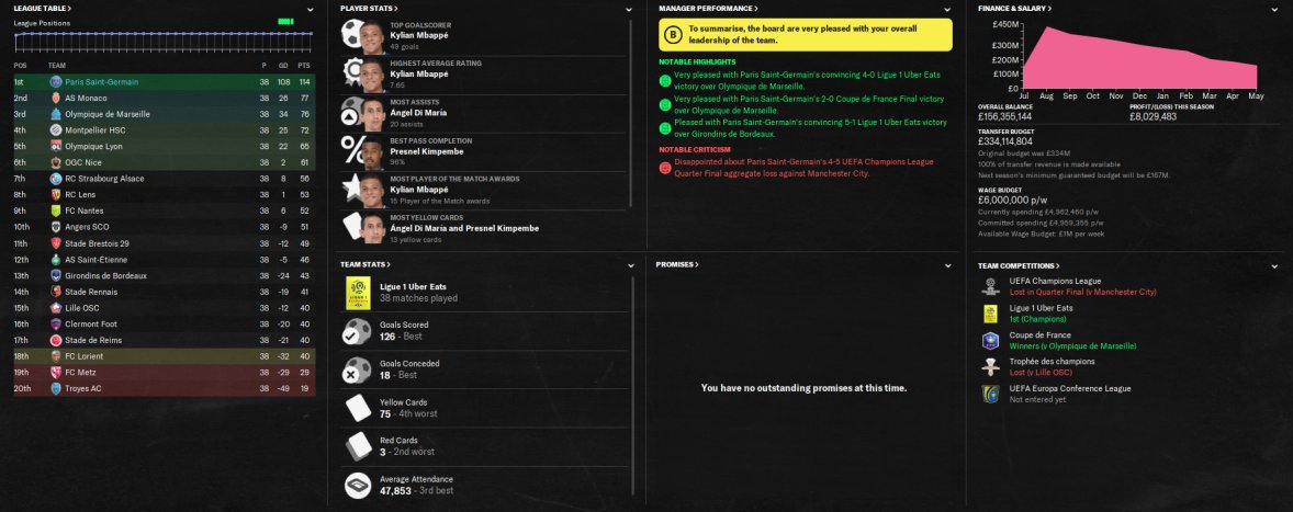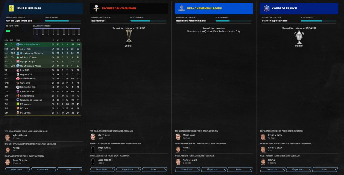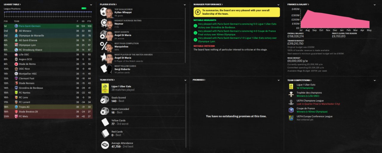 Just ran a quick test with PSG, I know I know its PSG and the French league is easy for them. Scored 140 and conceded just 16. Again holiday test, AM in charge of team selection and training. Won the Treble.