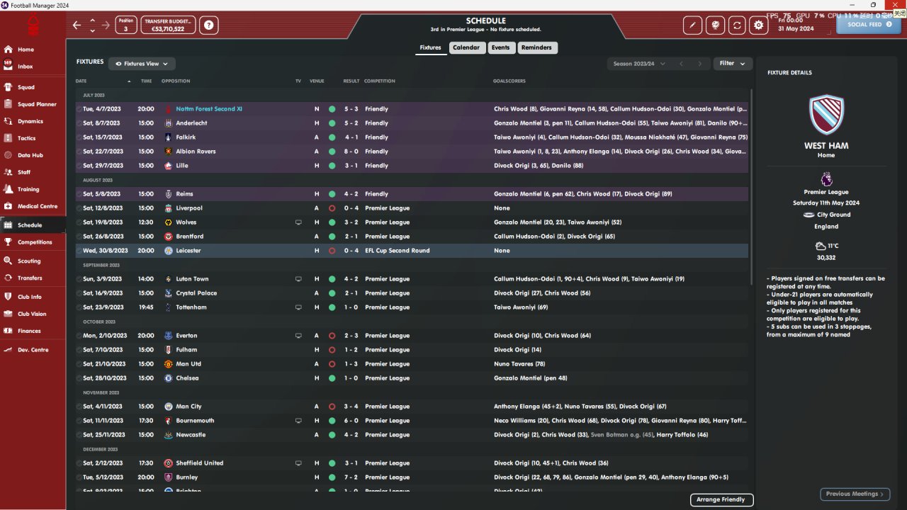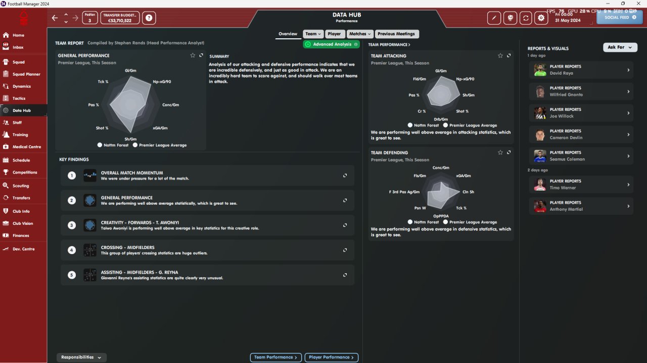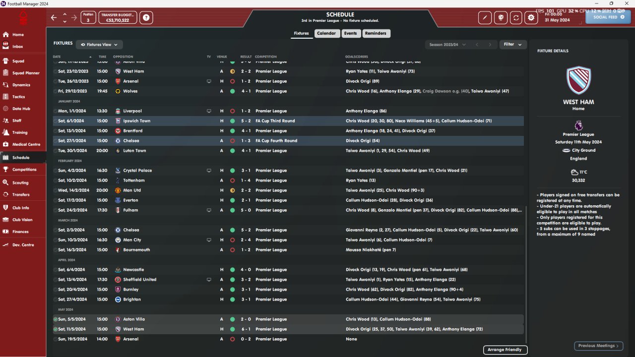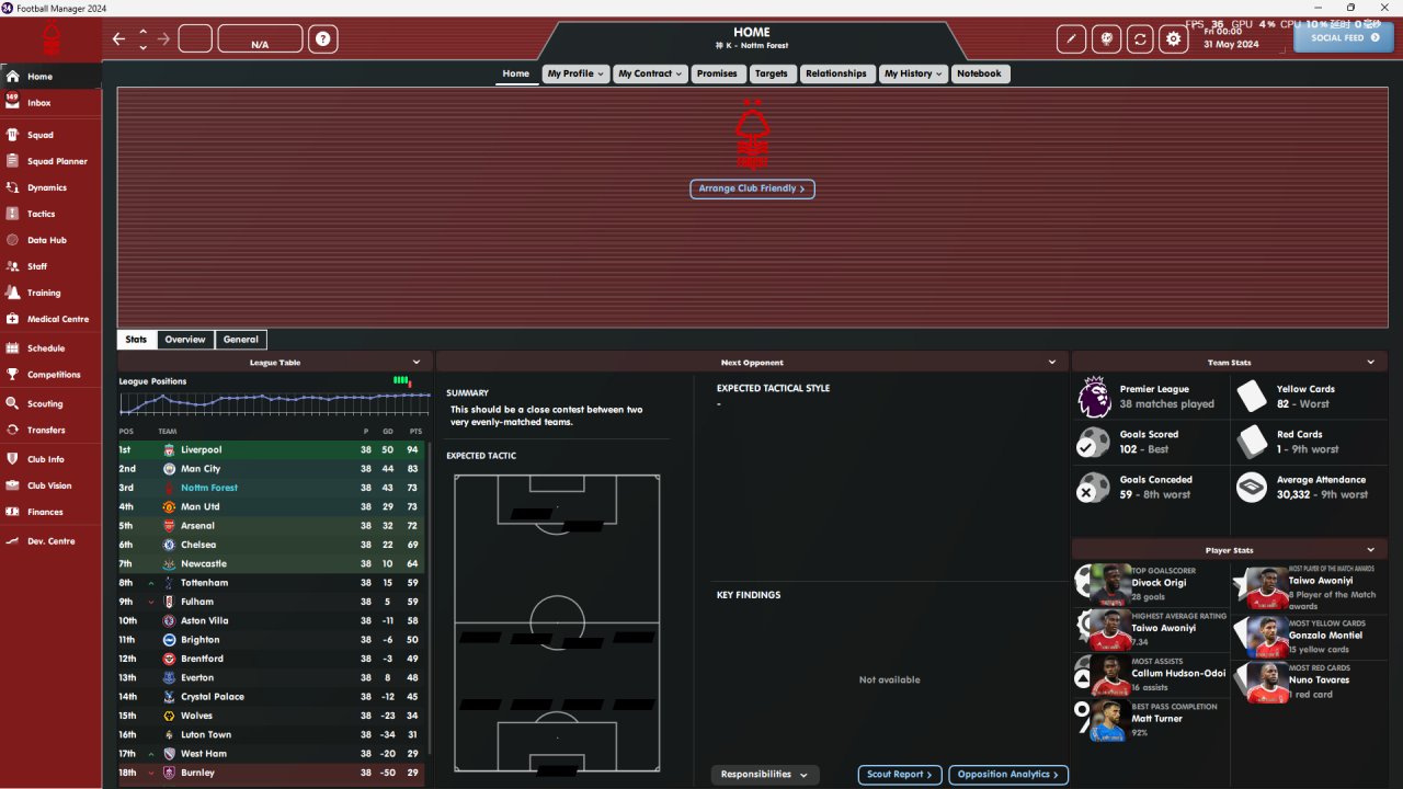 Nottingham Forest in the English Premier League simulated two seasons, with the highest ranking being third in the Premier League and the lowest ranking being sixth, with the lowest coaching attributes