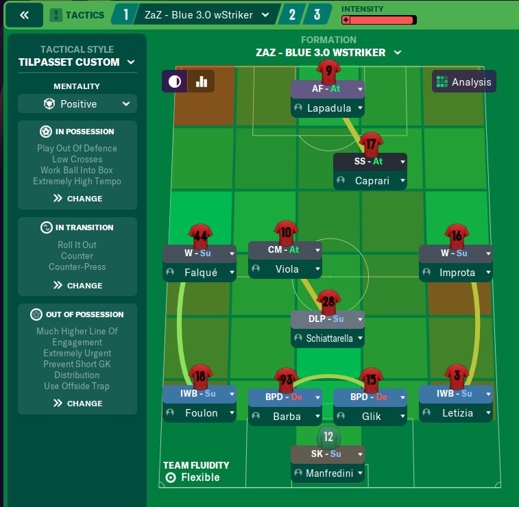 It's a tweak of (ZaZ - Blue 3.0) credit to him. I've changed it into a different formation, to get place for a striker. And it's working perfectly. Changed some player instructions and a lot of set pieces too.