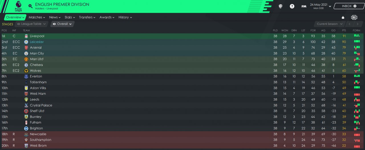 Leicester City finished 3rd with 107 goals, the most in the PL, and was the winner of the FA Cup and the Carabao Cup.
