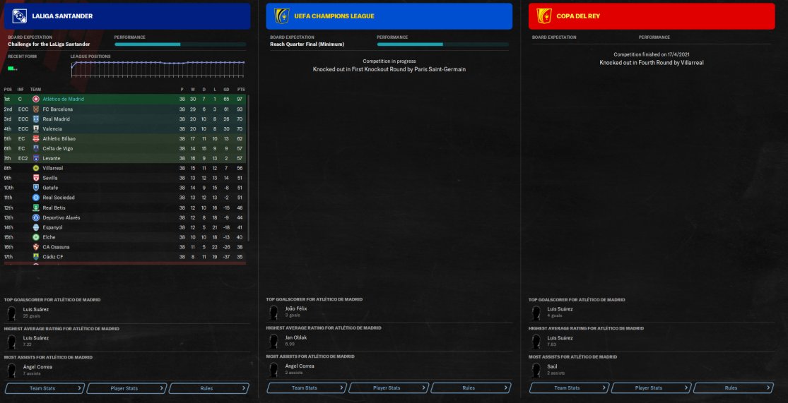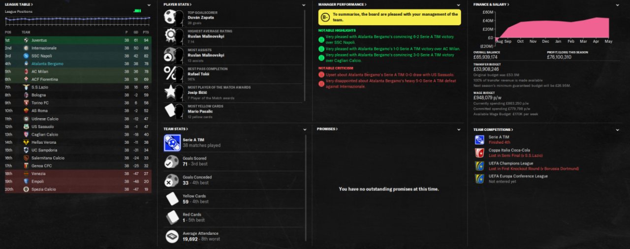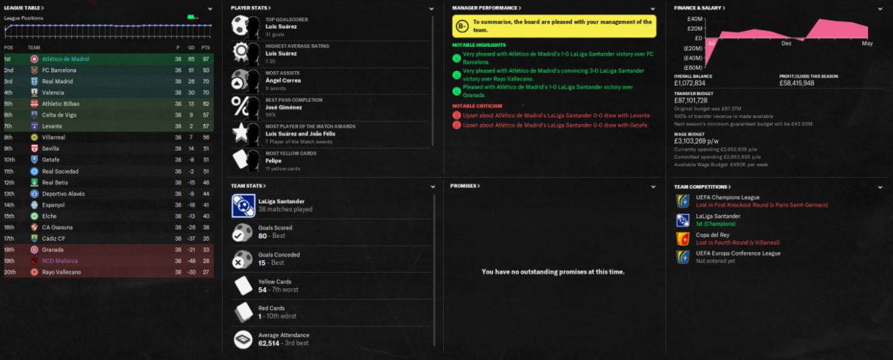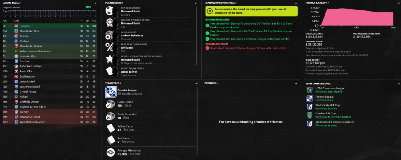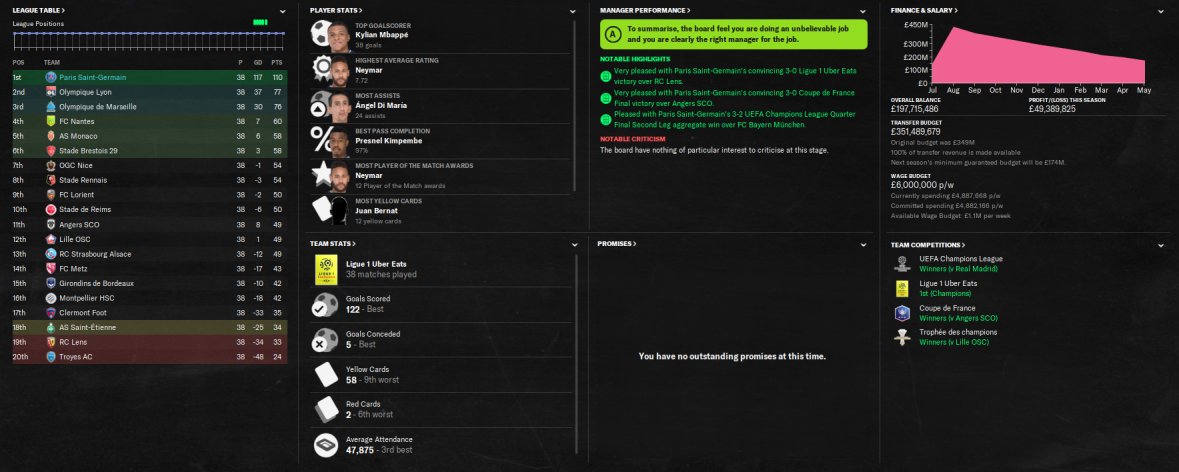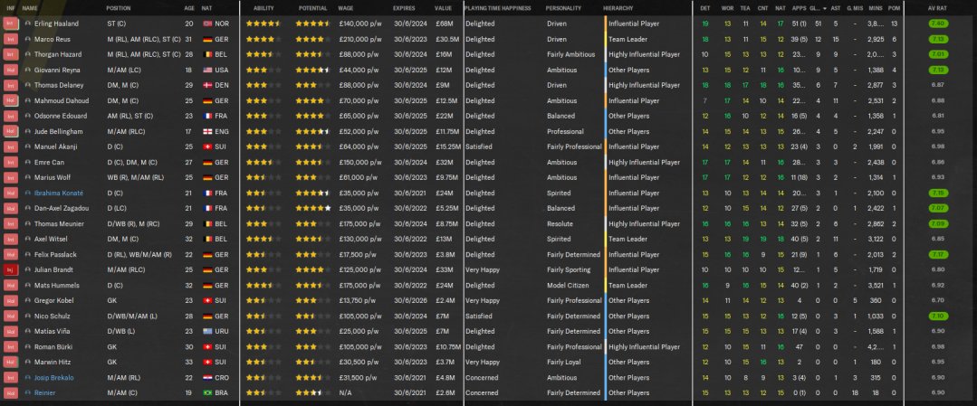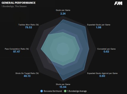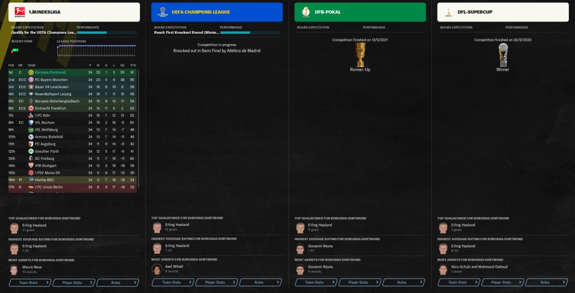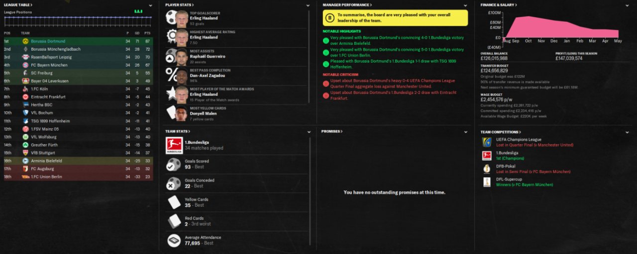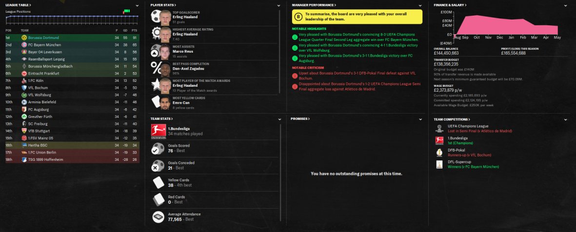 Dortmund Test completed. 91 points in the league. 11 points dropped. Ranked 1st for goals scored and conceded. Haaland 51 goals in all comps. Got the semi's of the UCL before being knocked out by A.Madrid. Defeated in the DFB-Pokal final and won the DFB-Supercup. So achieved a double, but didnt expect to get above 85 points in the league.