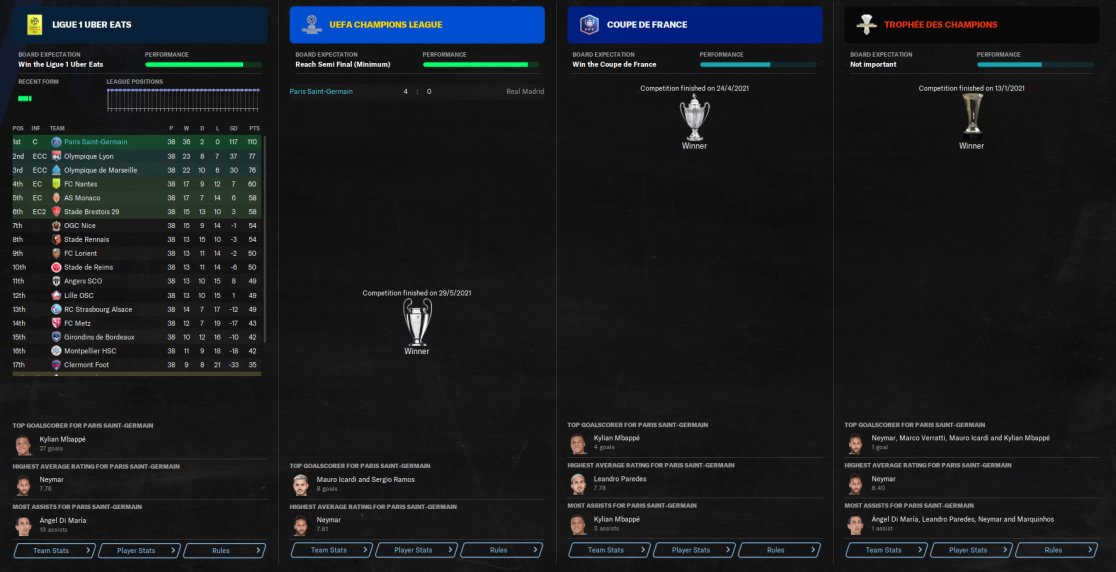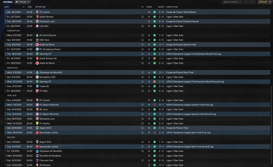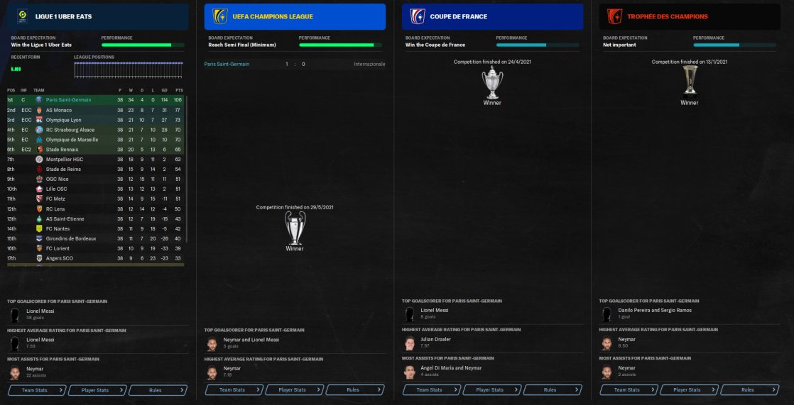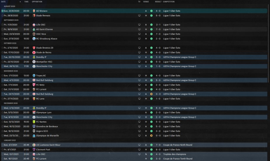 Ill start with PSG as the test was unbelievable, 38 games, 36 wins, 2 draws, 0 defeats. 122 goals scored and just 5 conceded. Yes ONLY 5 CONCEDED. Conceded 17 in all competitions, 5 of which came away against Man United in the CL. All Cups PSG entered, they won. 30 games in all comps without conceding a goal. 47 clean sheets in all comps, 34 in the league.
