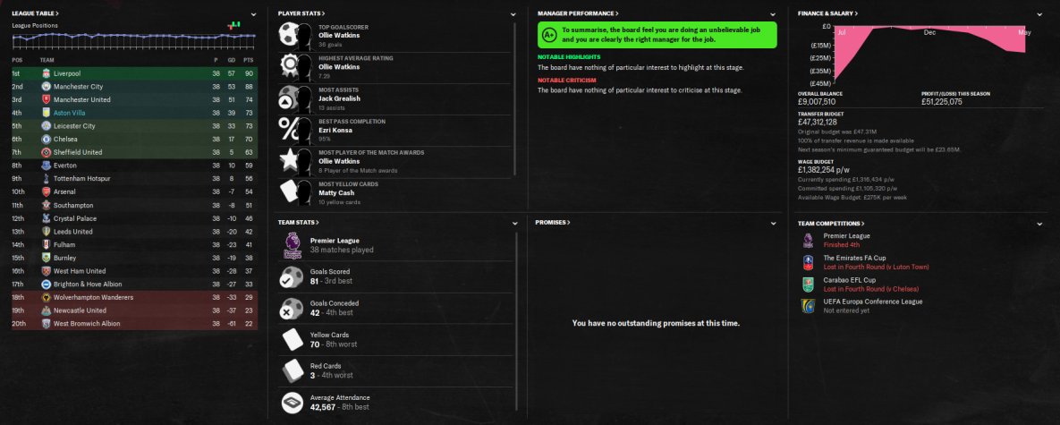 The Villa test proved that this tactic also works for underdogs, Villa are predicted 18th but managed to finish 4th. Only 1 point behind Man United in 3rd. Ollie Watkins scoring 36 goals. Villa were ranked 3rd for goals scored and 4th for goals conceded.